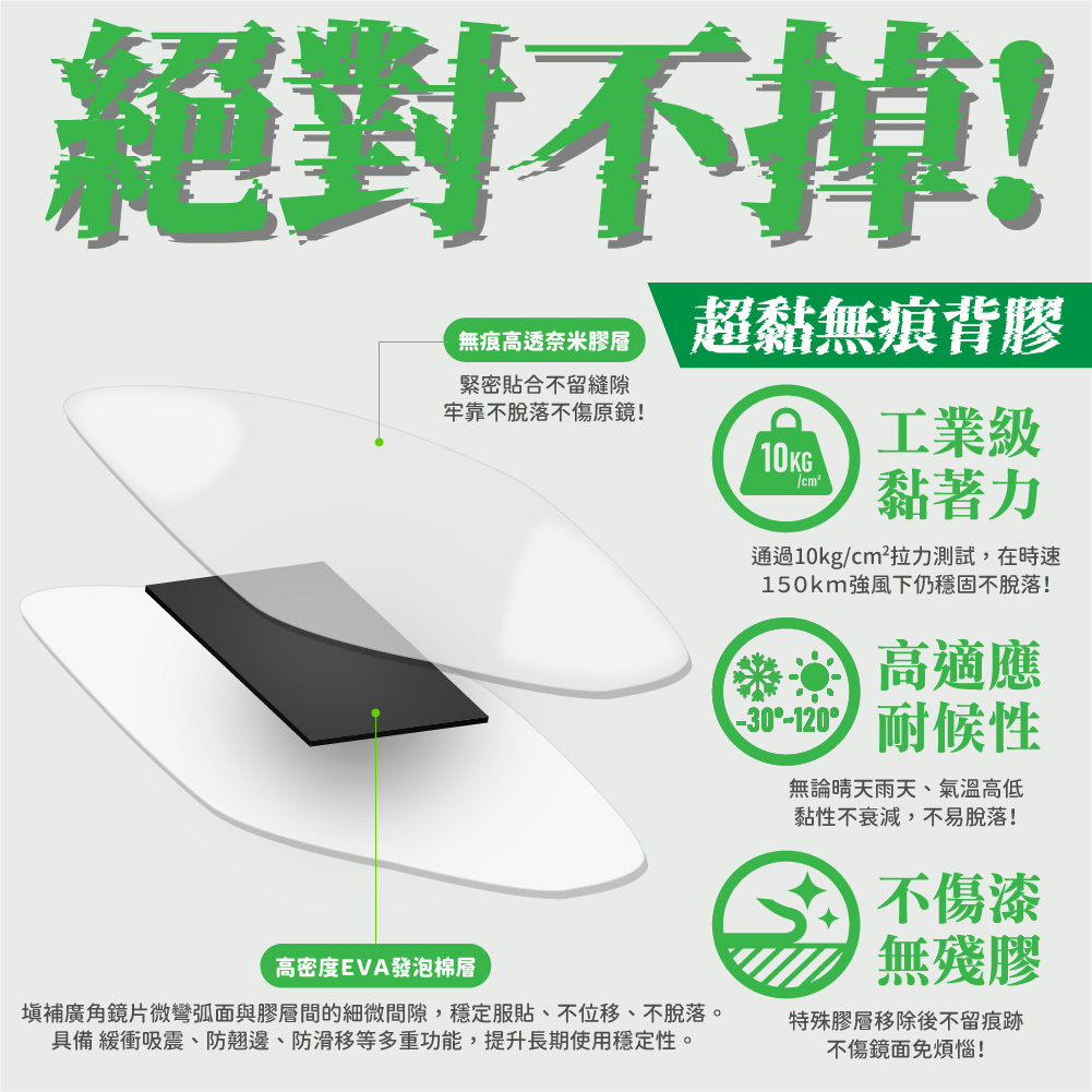 真玻璃材質實現 業界最大曲率 廣角設計,視野範圍較傳統鏡面擴大 2 倍,且邊緣無魚眼變形,左右車道與後方來車一覽無遺。