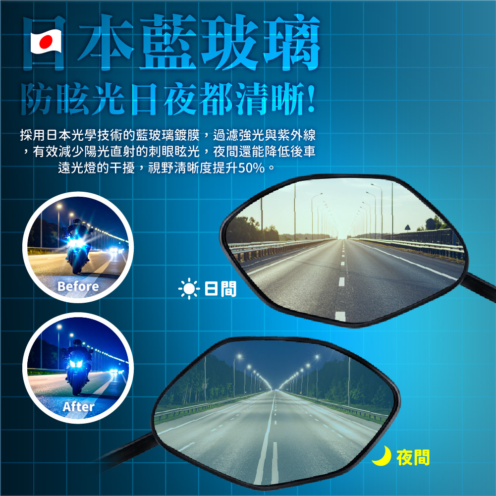 採用日本光學技術的藍玻璃鍍膜,過濾強光與紫外線,有效減少陽光直射的刺眼眩光,夜間還能降低後車遠光燈的干擾,視野清晰度提升50%。