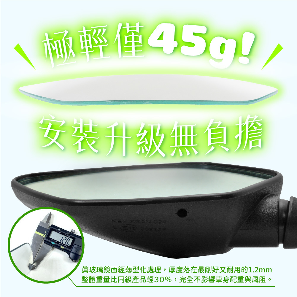 真玻璃鏡面經 薄型化處理(厚度 1.2mm),整體重量比同級產品輕 30%,完全不影響車身配重與風阻。