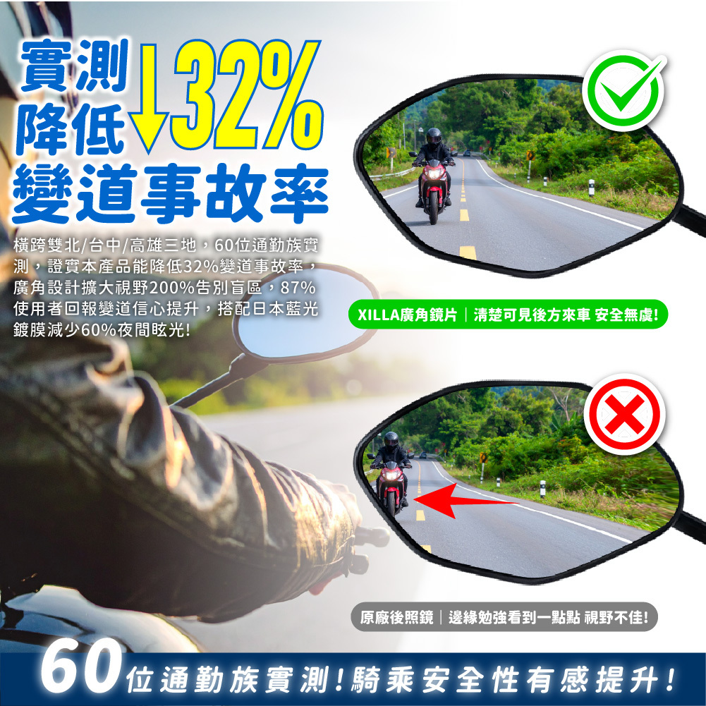 橫跨雙北/台中/高雄三地,60位通勤族實測,證實本產品能降低32%變道事故率,廣角設計擴大視野200%告別盲區,87%使用者回報變道信心提升,搭配日本藍光鍍膜減少60%夜間眩光