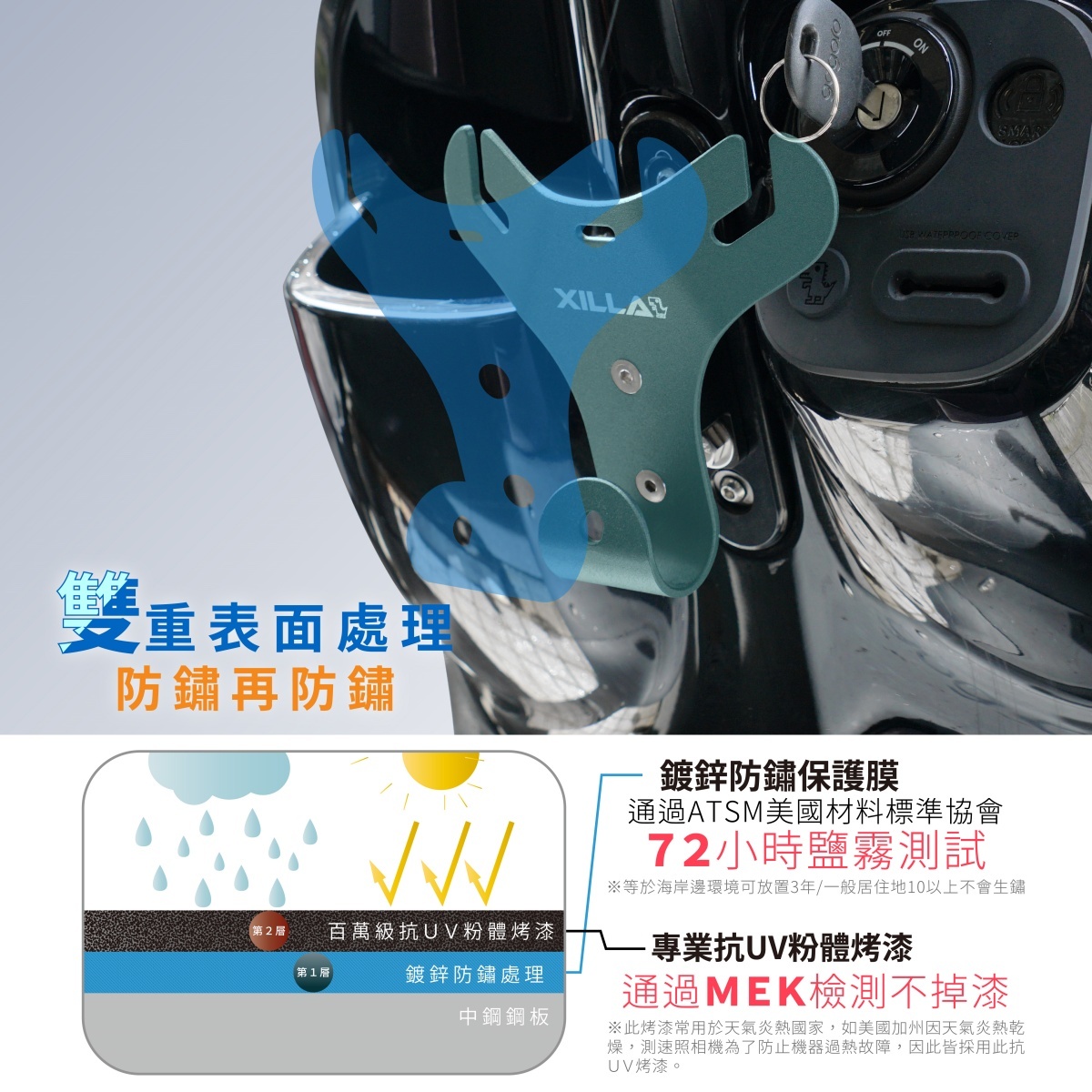 👍通過72小時美國材料標準協會制定鹽霧測試,(等同於機車停放在海岸邊3年不動也不會生鏽,一般居住地方10年以上)
