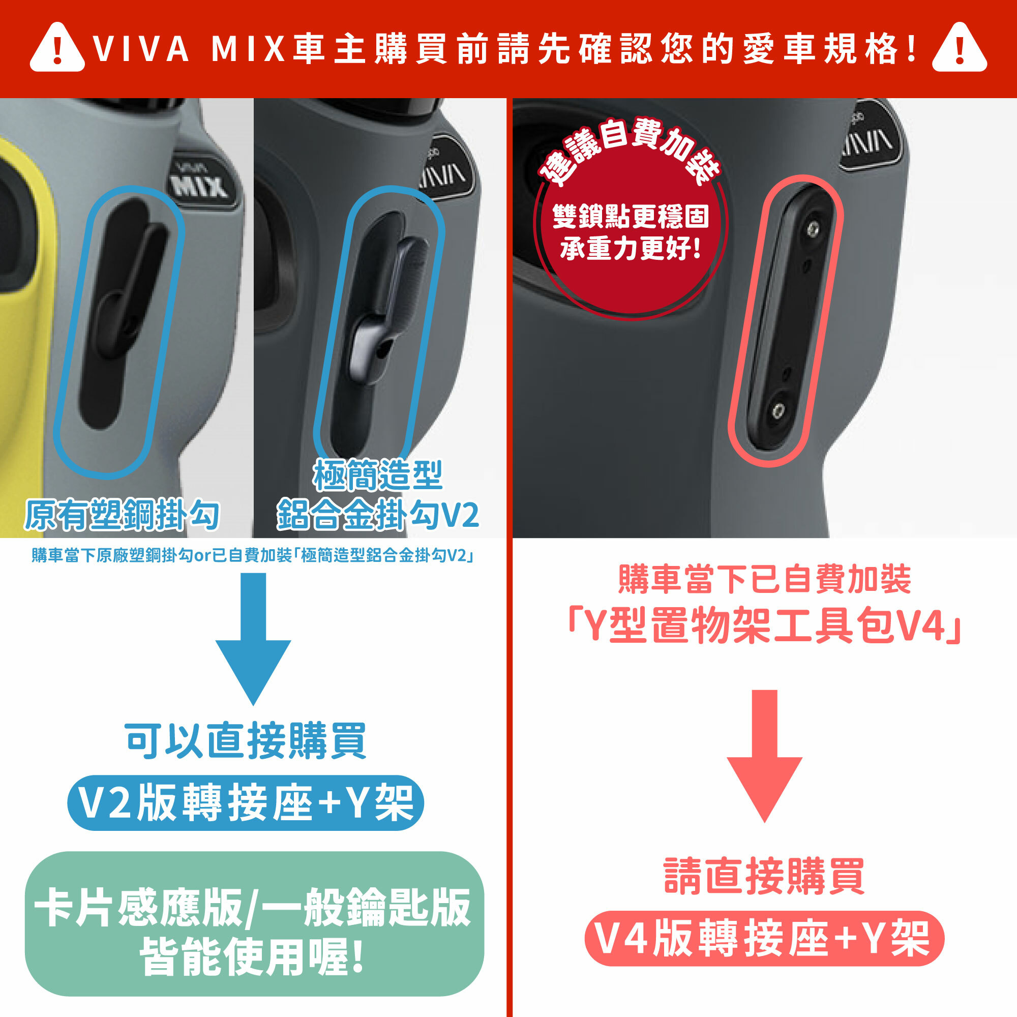 1.購車當下已有「原廠塑鋼掛勾」或您有另外自費加裝「極簡造型鋁合金掛勾V2」請選--原廠塑鋼掛勾/鋁合金造型掛勾V2-MIX