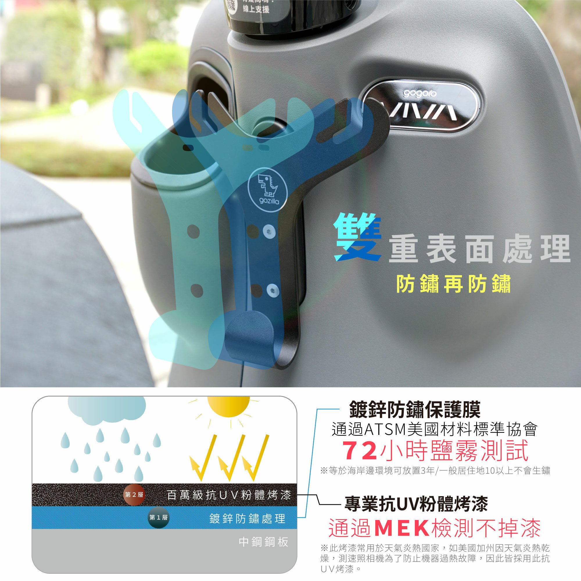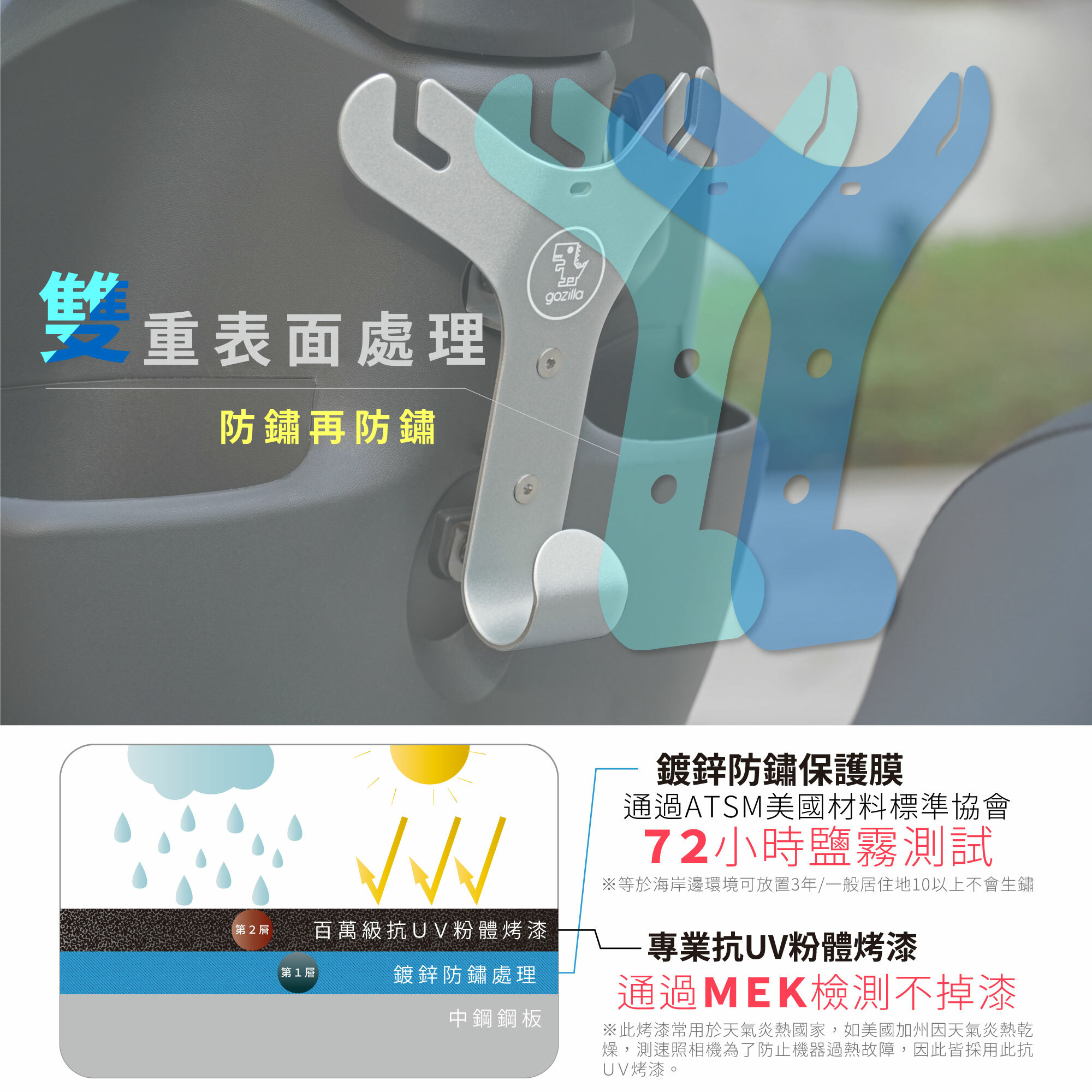 👍通過72小時美國材料標準協會制定鹽霧測試,(等同於機車停放在海岸邊3年不動也不會生鏽,一般居住地方10年以上)