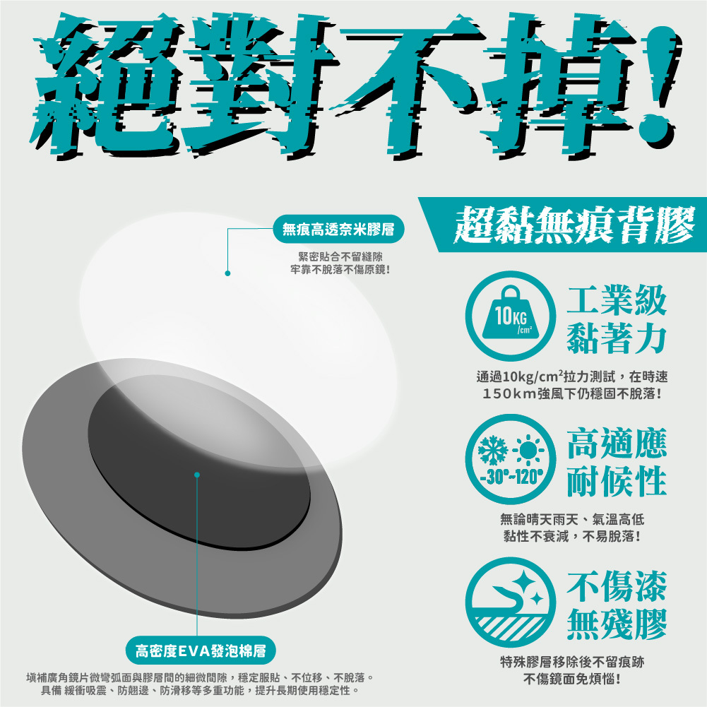 真玻璃材質實現 業界最大曲率 廣角設計,視野範圍較傳統鏡面擴大 2 倍,且邊緣無魚眼變形,左右車道與後方來車一覽無遺。