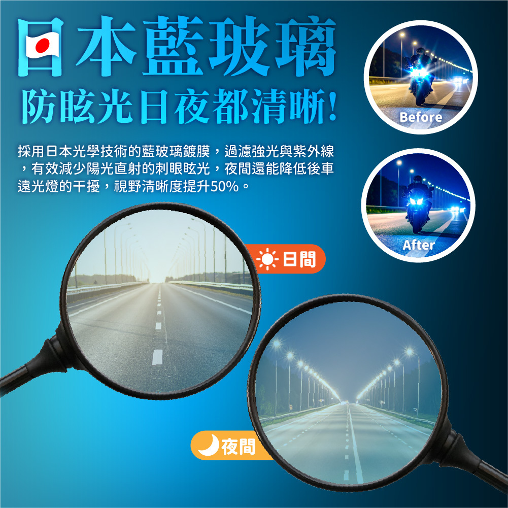 採用日本光學技術的藍玻璃鍍膜,過濾強光與紫外線,有效減少陽光直射的刺眼眩光,夜間還能降低後車遠光燈的干擾,視野清晰度提升50%。