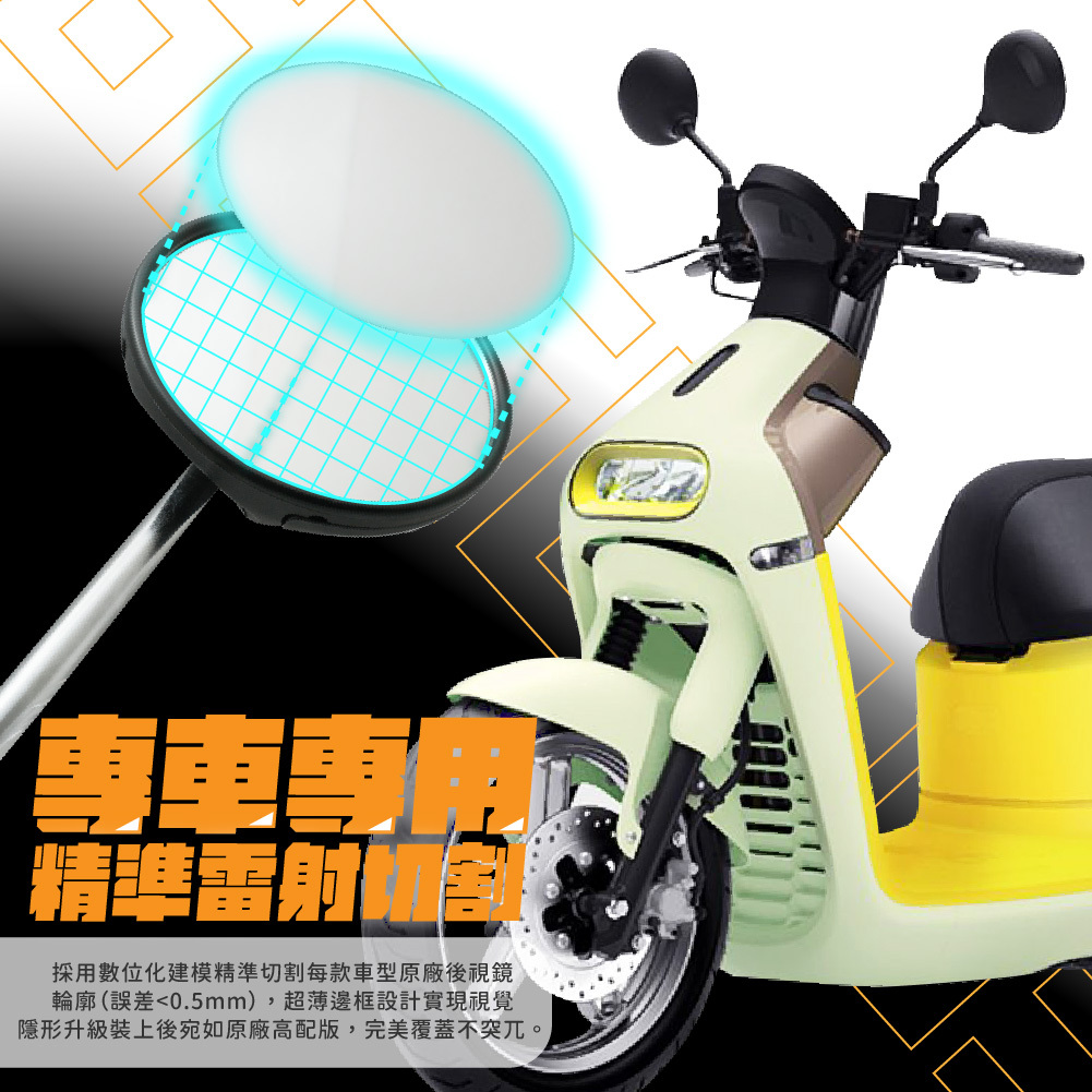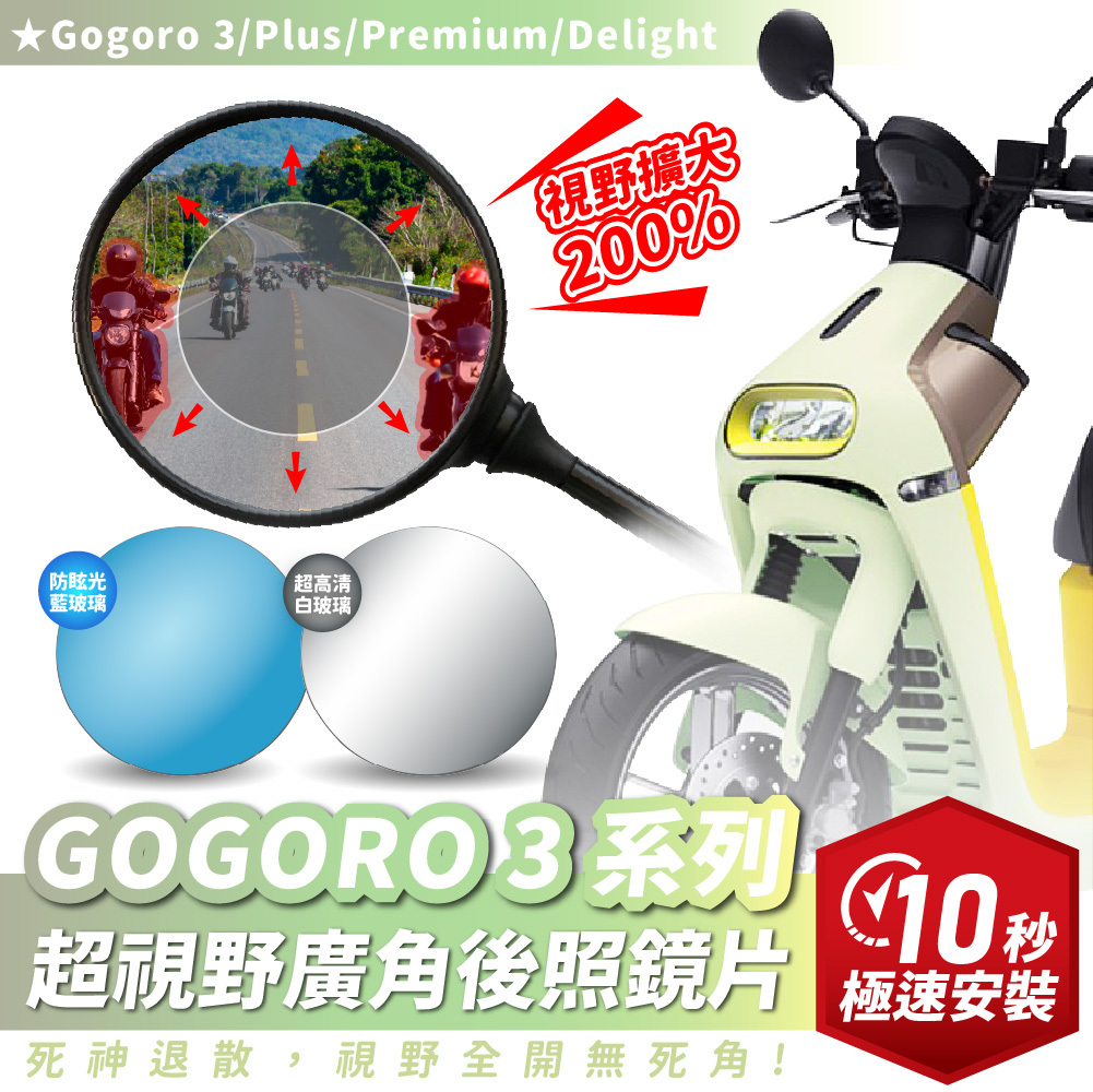 GOGORO 3 系列專用超視野廣角後照鏡片,採用高清鏡面材質,視野範圍更寬廣,有效減少後方死角,提升行車安全。防眩光設計,在夜間或強光下依然清晰不刺眼。專車專用尺寸,安裝簡單牢固,不影響原廠外觀。防水防霧塗層,雨天使用依舊清晰,讓您騎乘更安心。