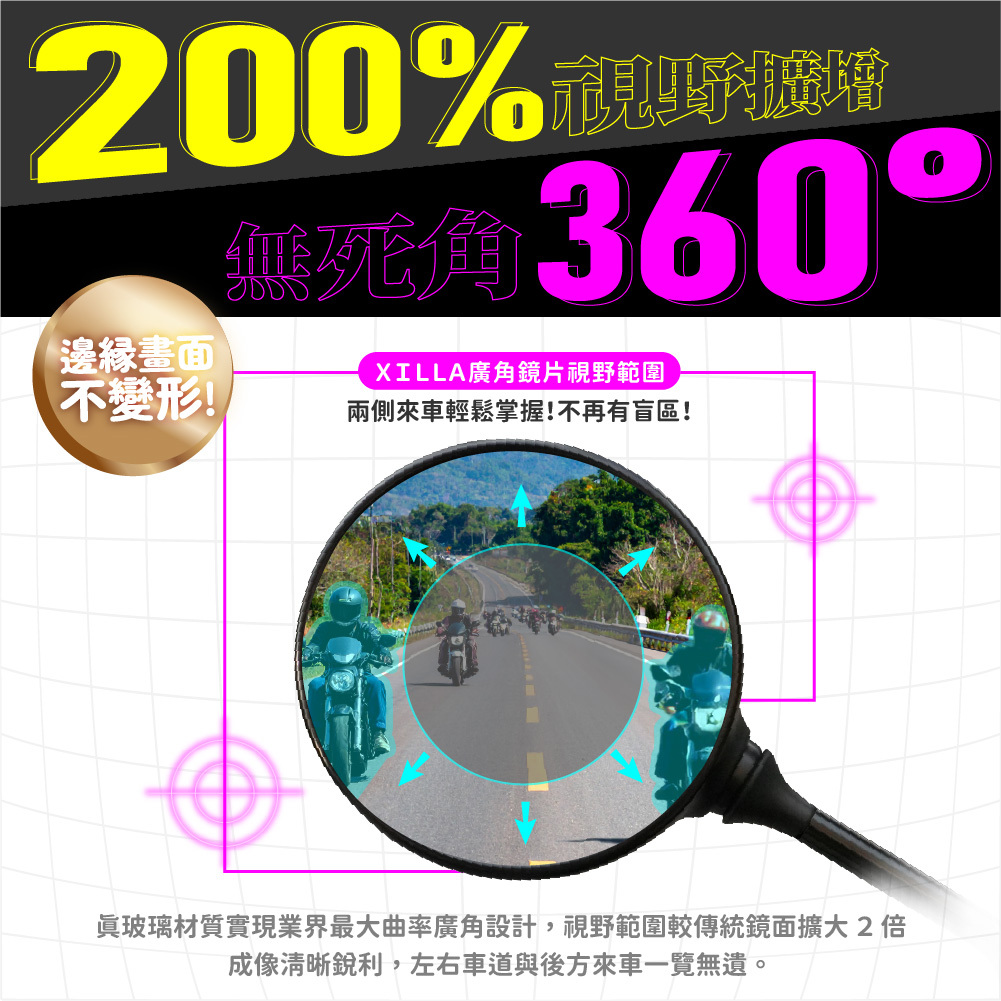 真玻璃材質實現 業界最大曲率 廣角設計,視野範圍較傳統鏡面擴大 2 倍,且邊緣無魚眼變形,左右車道與後方來車一覽無遺。