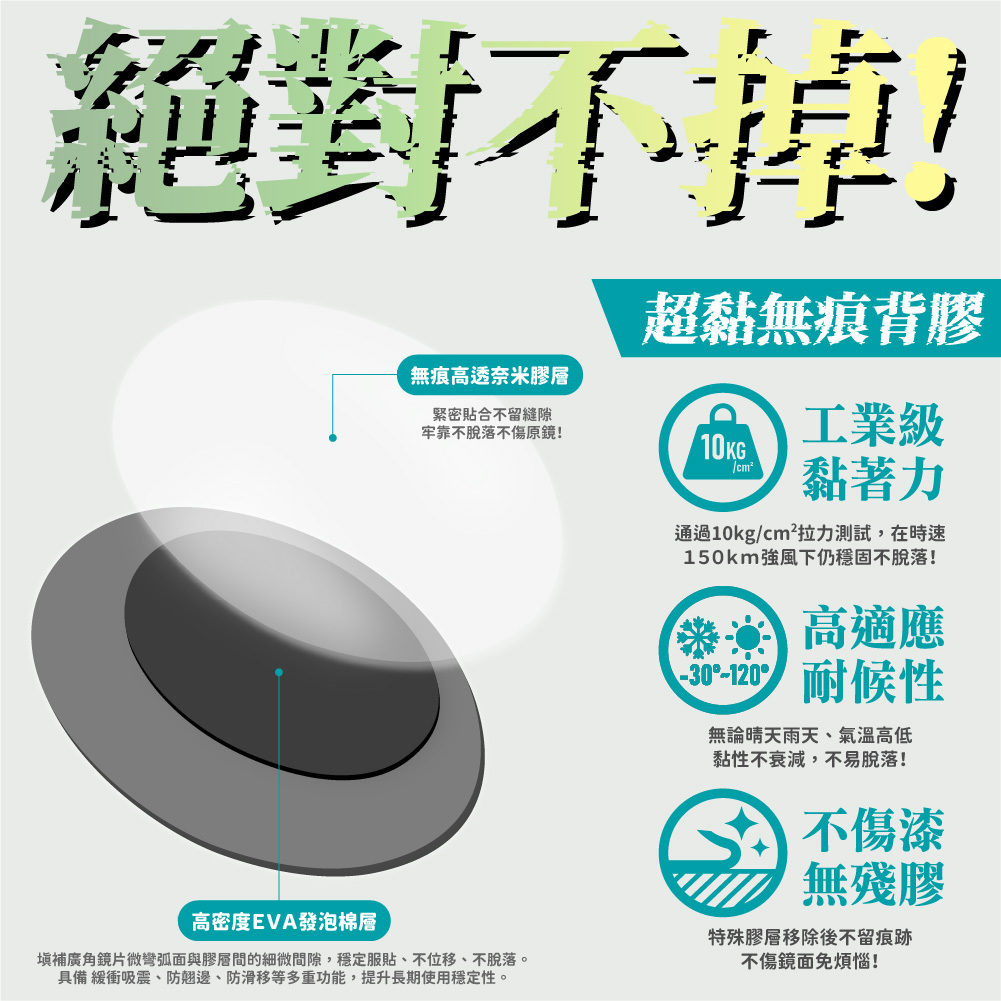 ●廣角鏡片可剛好卡在原廠後照鏡鏡框內,邊緣黑邊是原廠後照鏡原本就有的,而側面看鏡片會發現稍微突出邊框也是正常現象,並不影響使用。