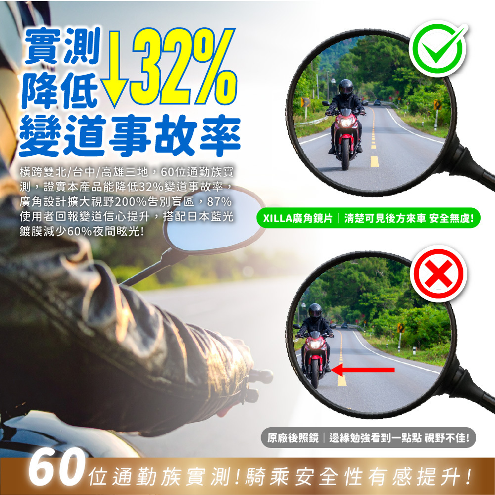 橫跨雙北/台中/高雄三地,60位通勤族實測,證實本產品能降低32%變道事故率,廣角設計擴大視野200%告別盲區,87%使用者回報變道信心提升,搭配日本藍光鍍膜減少60%夜間眩光