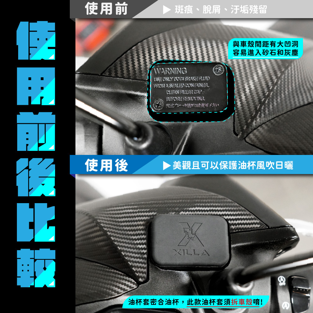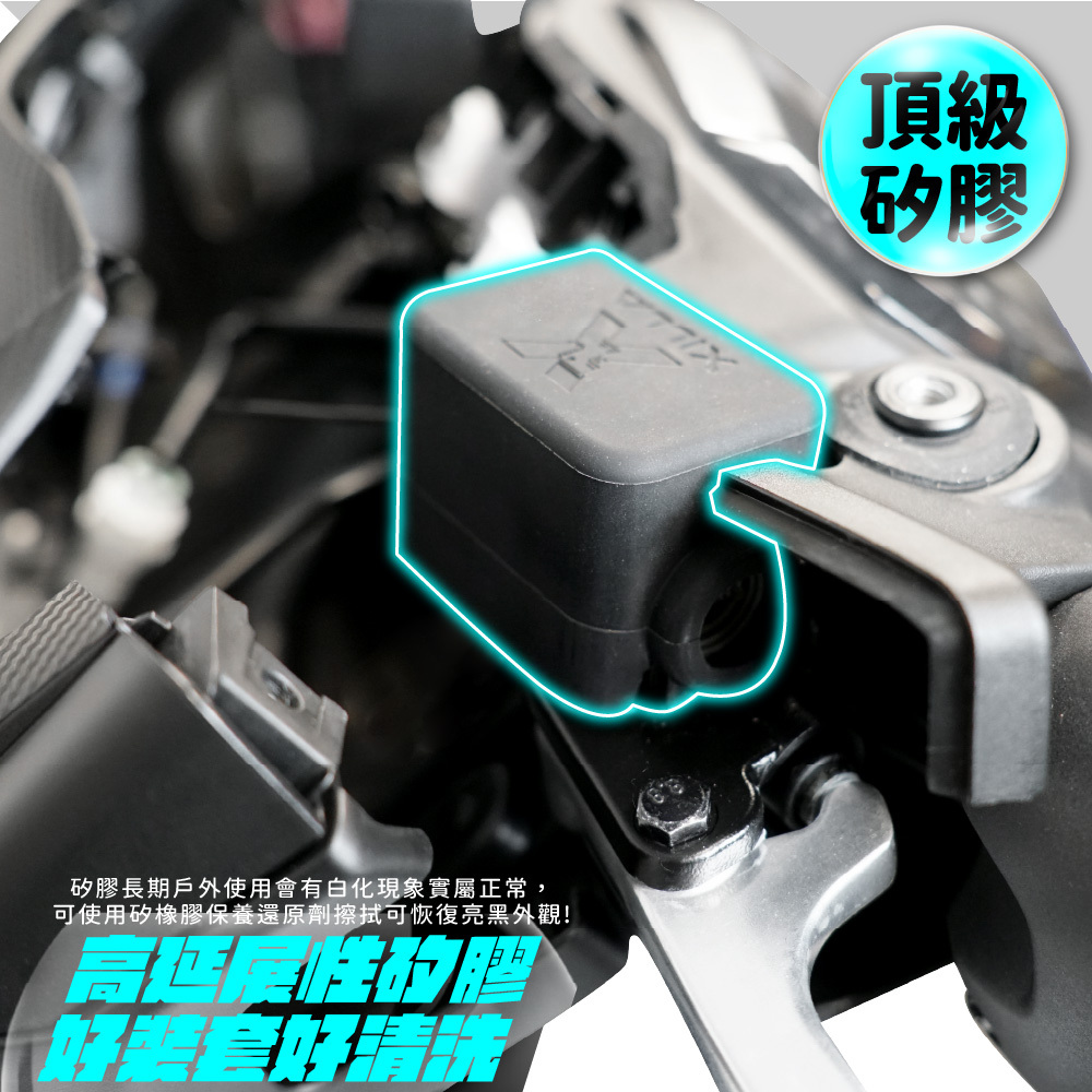專為勁戰七代前煞車油杯設計,貼合原廠尺寸,安裝簡單不需工具。採用高彈性矽膠材質,具備耐熱、耐候、不易老化特性,可有效阻擋日曬雨淋與外力刮傷,延長煞車油杯使用壽命。柔軟包覆能減緩震動,並在煞車油微量滲出時避免直接滴落至車殼,降低對烤漆造成的腐蝕風險。外觀低調俐落,兼顧實用與細節質感,是日常騎乘與長時間停放戶外車輛的實用防護配件。