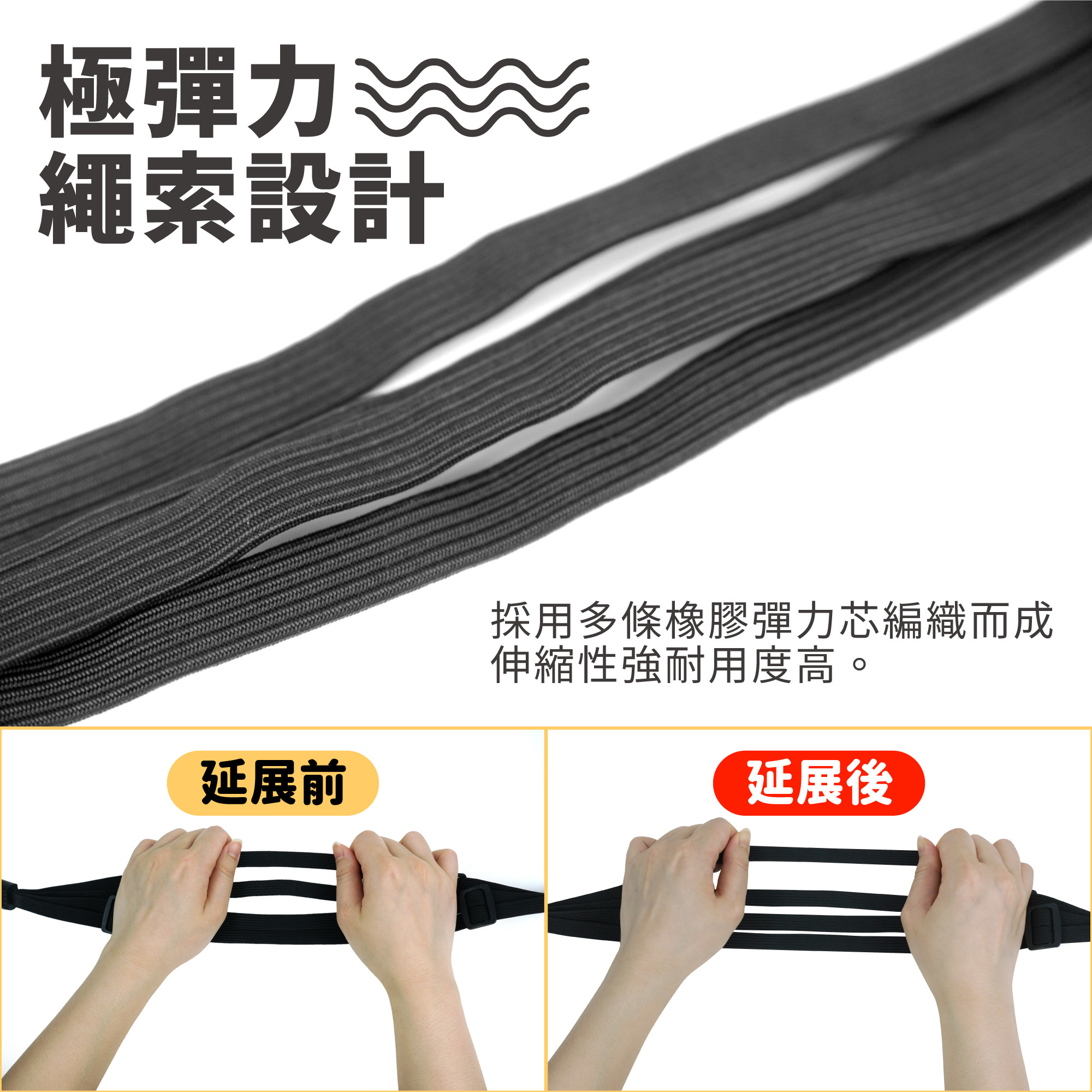 🎖高彈力繩索,內部由數條高彈力橡膠芯編織而成