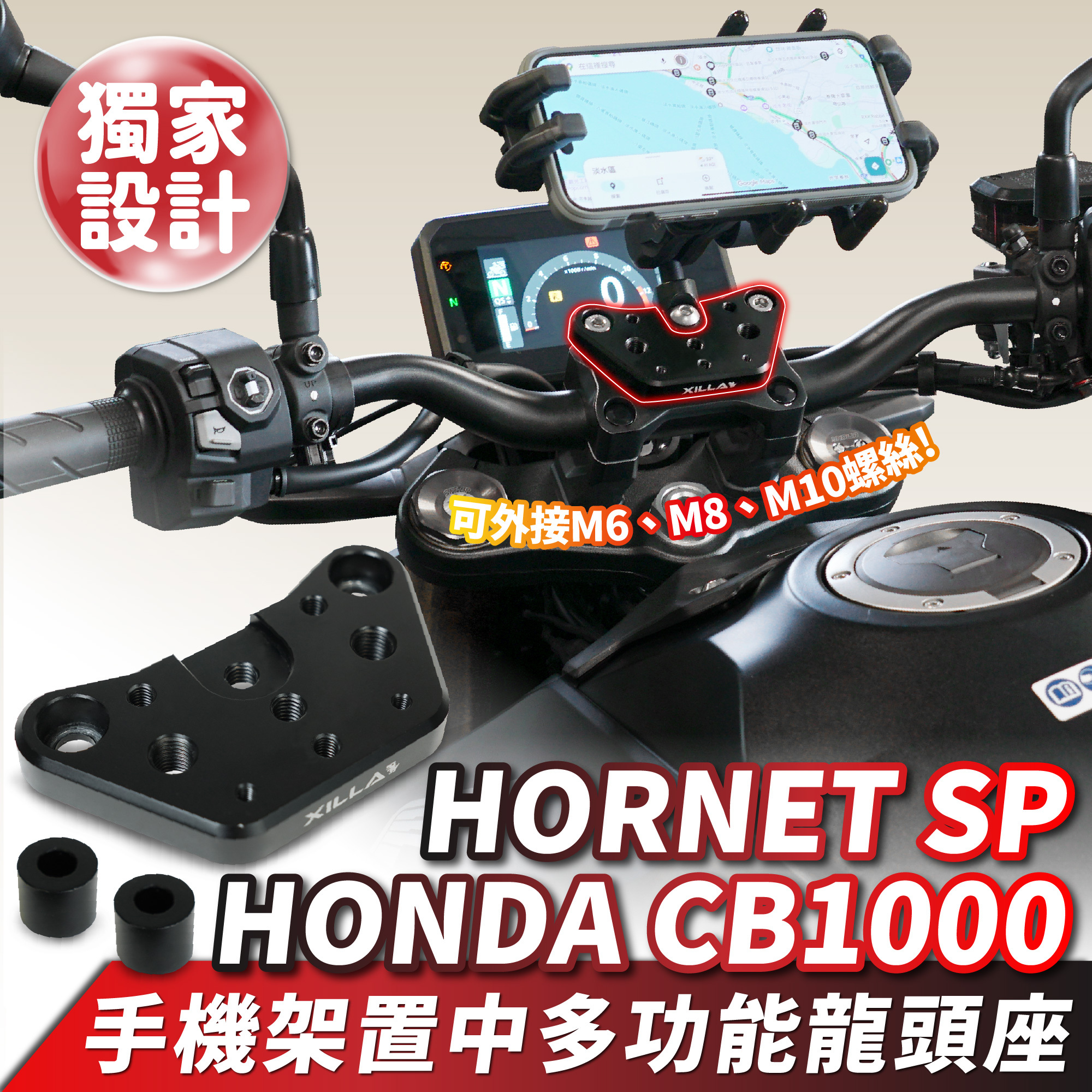 採用高強度CNC鋁合金一體成型製作,兼具剛性與輕量化特性,有效提升操控穩定性與整車質感。表面經陽極氧化處理,抗腐蝕、耐刮不褪色,長期使用仍能保持亮麗外觀。龍頭座上預留多組安裝孔位,可自由擴充手機架、運動攝影機、導航支架等多項周邊,滿足騎士不同的使用需求。專為 HONDA CB1000 HORNET SP 專車開模,尺寸精準密合,安裝簡單不需修改線路或車體結構。無論是日常通勤或長途旅程,都能讓操駕更安全便利,展現個性化風格與專業騎乘品味。