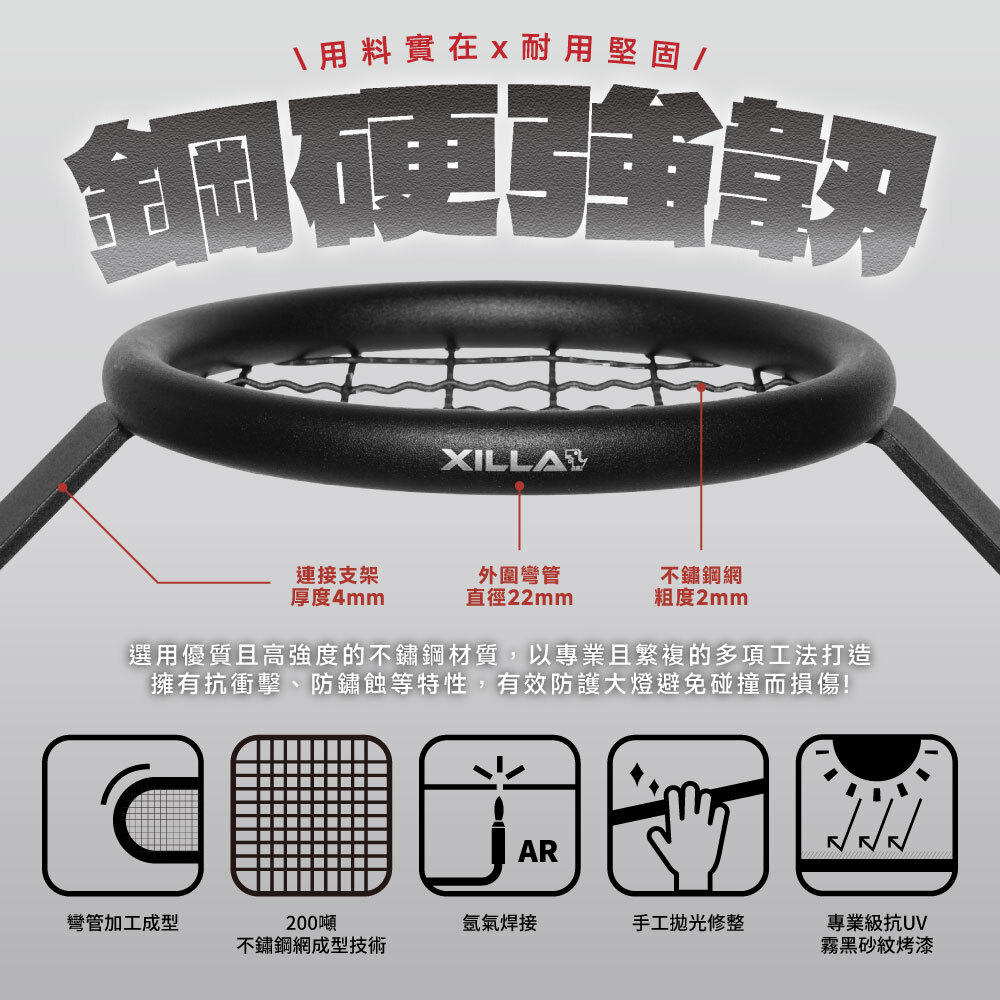 全系列表面經抗 UV 防鏽烤漆處理,耐候性佳、外觀持久如新。前架具多功能孔洞與擴充鎖孔,可加裝配件;波浪護網不影響照明亮度,同時防止飛石撞擊大燈,展現帥氣又實用的整體風格。