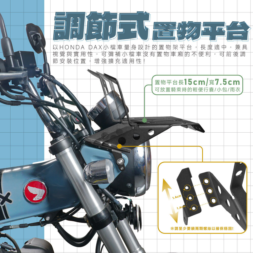 🔴由於DAX 車身龍頭輕巧,故前置物架不建議放置過多或過重物品,建議承重1-3kg內。