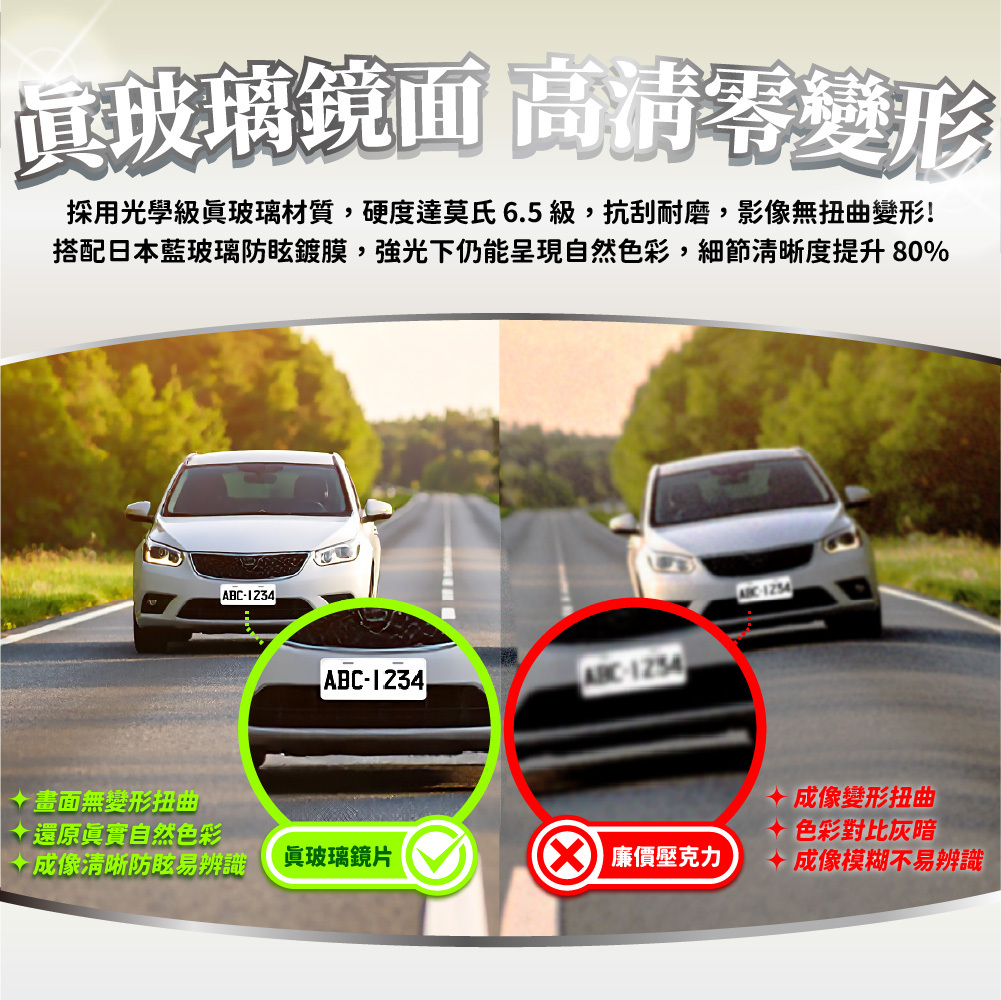 真玻璃材質實現 業界最大曲率 廣角設計,視野範圍較傳統鏡面擴大 2 倍,且邊緣無魚眼變形,左右車道與後方來車一覽無遺。
