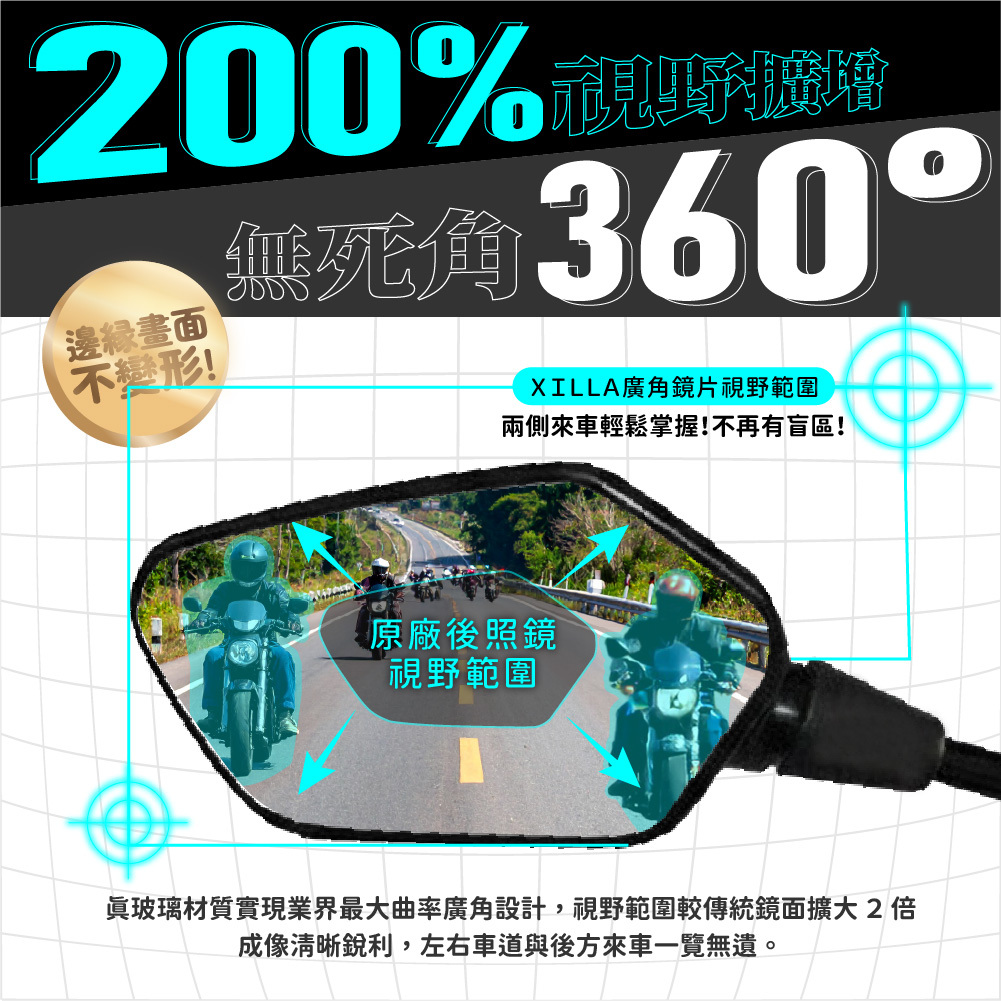 ●鏡片主要以凸面廣角來增大視野範圍,同時也會使鏡中的物體看起來比原本的更小,安裝後可能需重新適應後方來車的距離,初期請小心騎乘以避免交通事故。