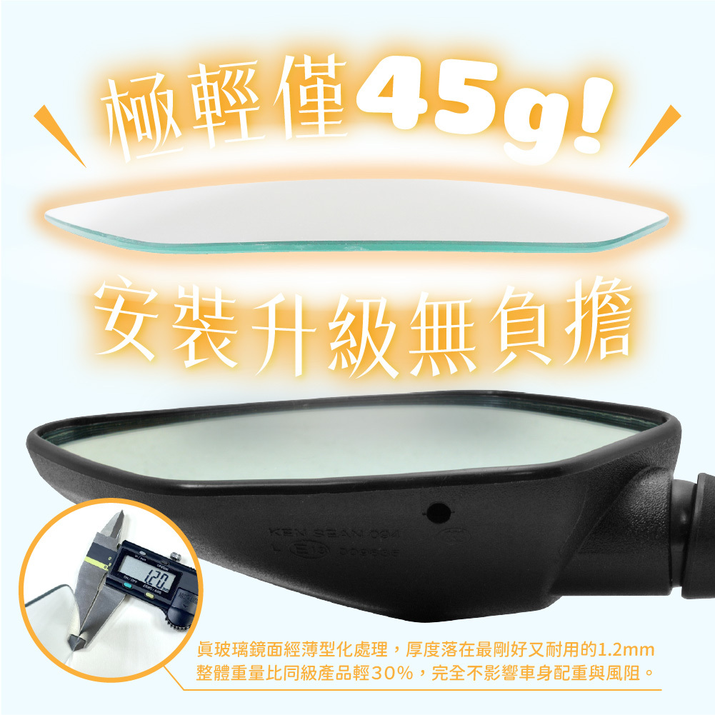 真玻璃鏡面經 薄型化處理(厚度 1.2mm),整體重量比同級產品輕 30%,完全不影響車身配重與風阻。