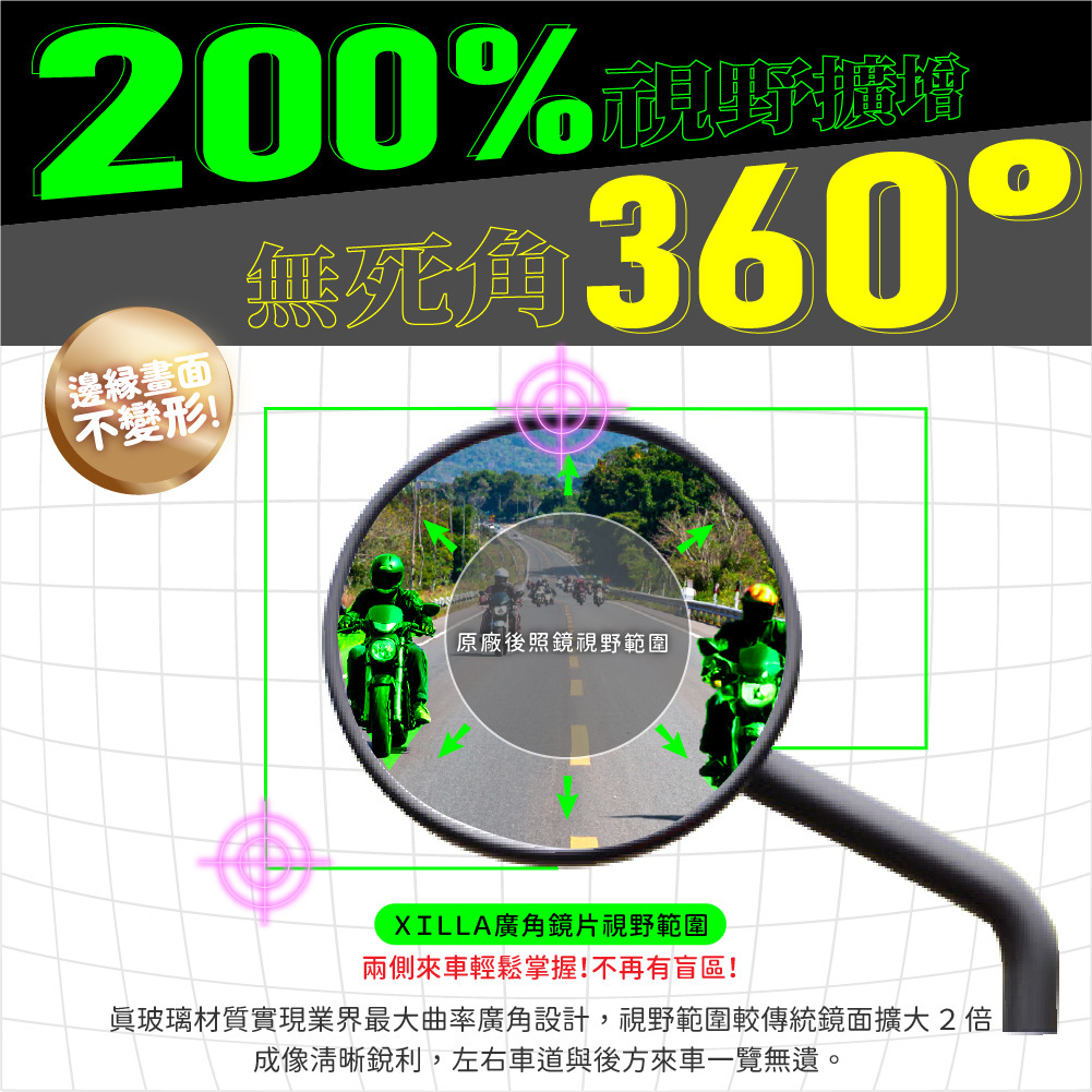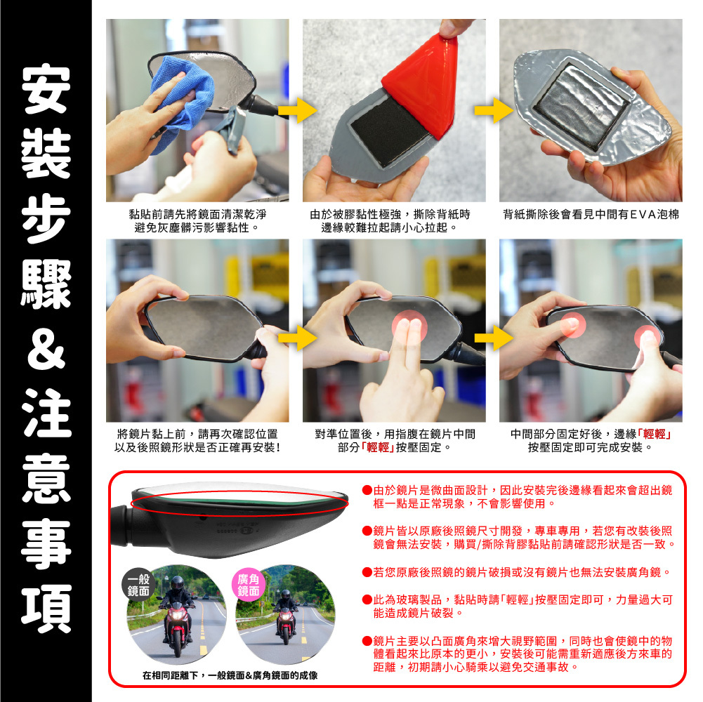 ●鏡片主要以凸面廣角來增大視野範圍,同時也會使鏡中的物體看起來比原本的更小,安裝後可能需重新適應後方來車的距離,初期請小心騎乘以避免交通事故。