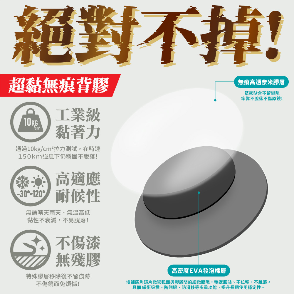 ●廣角鏡片可剛好卡在原廠後照鏡鏡框內,邊緣黑邊是原廠後照鏡原本就有的,而側面看鏡片會發現稍微突出邊框也是正常現象,並不影響使用。