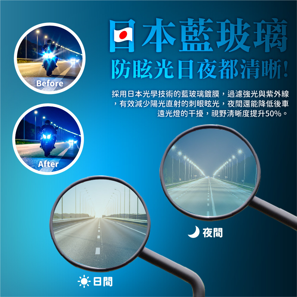 採用日本光學技術的藍玻璃鍍膜,過濾強光與紫外線,有效減少陽光直射的刺眼眩光,夜間還能降低後車遠光燈的干擾,視野清晰度提升50%。