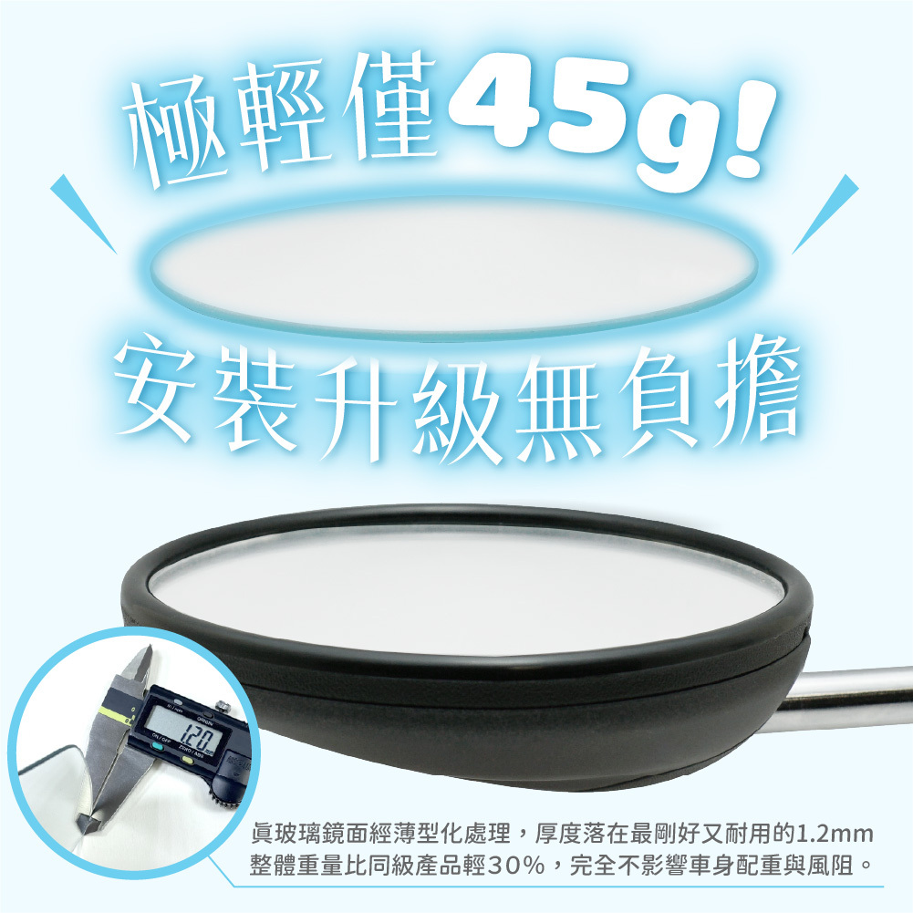 真玻璃鏡面經 薄型化處理(厚度 1.2mm),整體重量比同級產品輕 30%,完全不影響車身配重與風阻。