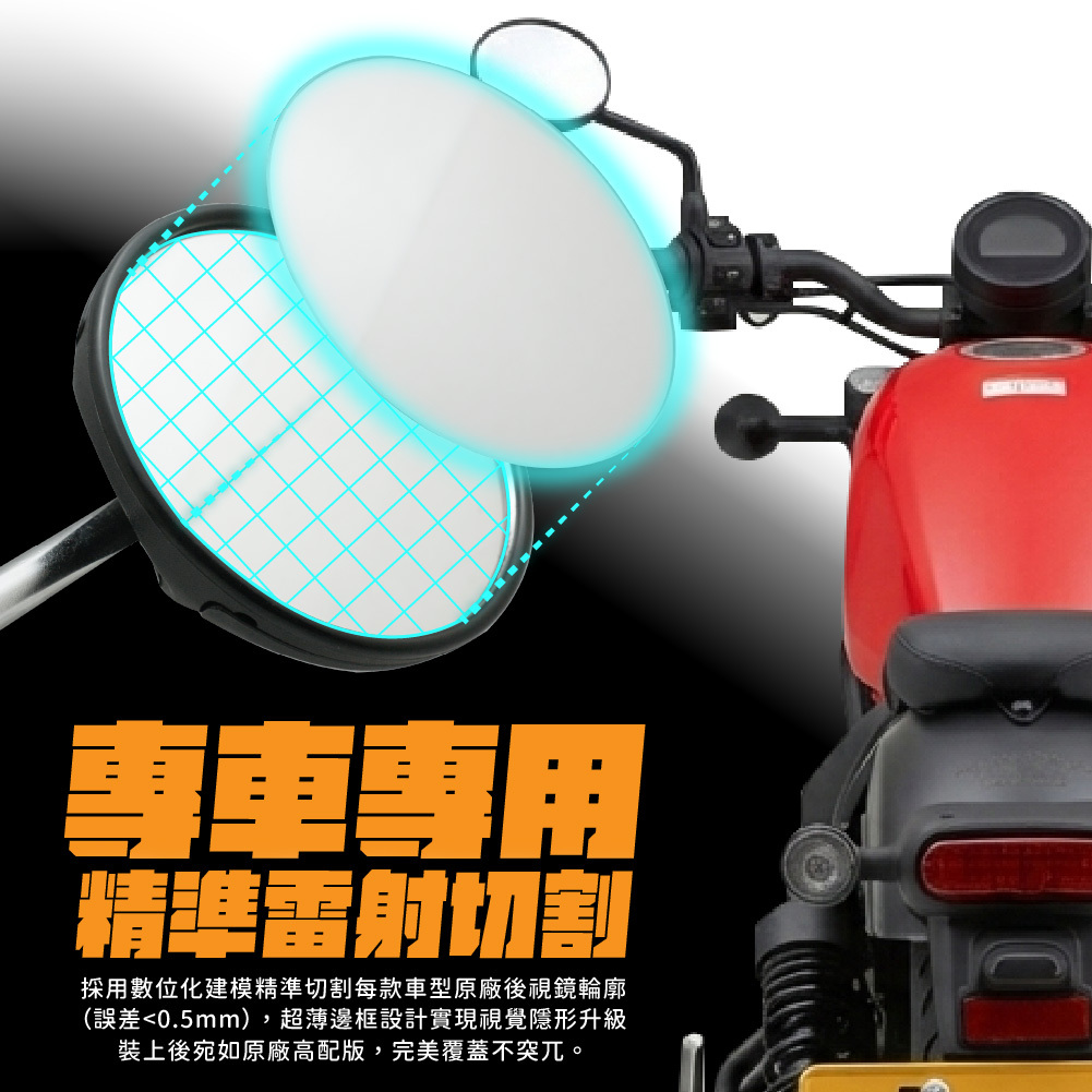 改裝 後照鏡 是提升 Honda Rebel 500 騎乘安全感與視野的重要選項,尤其原廠鏡面視野範圍較窄,有時會被騎士的肩膀遮擋,影響後方車況判斷。經由選用 廣角鏡片或加大鏡面 的後照鏡,可以明顯擴展後方視野、減少盲點,有助於換線、超車與市區行駛時的安全性提升。這種廣角後照鏡通常採用 凸面鏡片 設計,鏡面彎曲度較高,使你能一次看到更多後方與側後方的車輛動態。