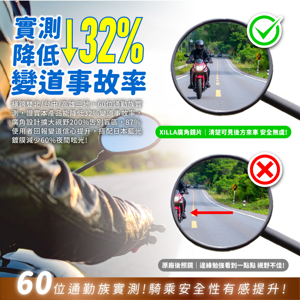 橫跨雙北/台中/高雄三地,60位通勤族實測,證實本產品能降低32%變道事故率,廣角設計擴大視野200%告別盲區,87%使用者回報變道信心提升,搭配日本藍光鍍膜減少60%夜間眩光