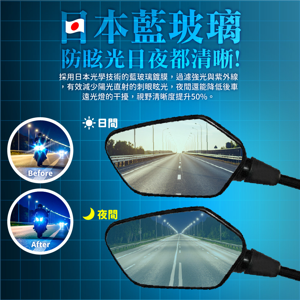 採用日本光學技術的藍玻璃鍍膜,過濾強光與紫外線,有效減少陽光直射的刺眼眩光,夜間還能降低後車遠光燈的干擾,視野清晰度提升50%。