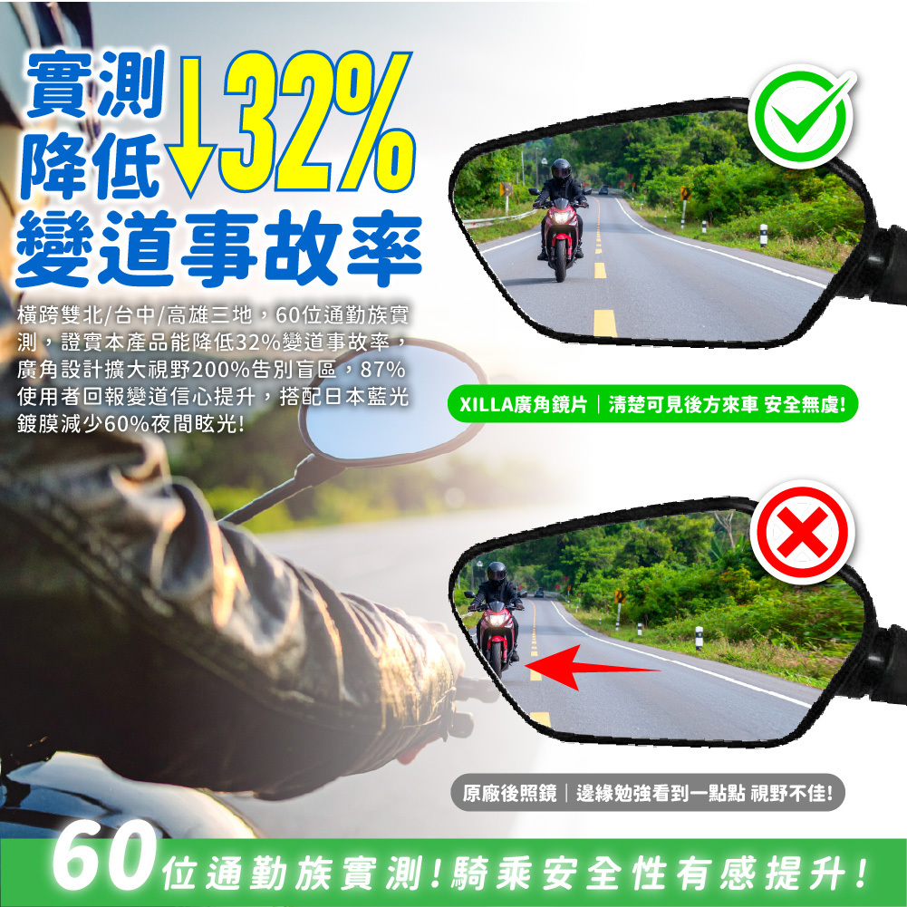 橫跨雙北/台中/高雄三地,60位通勤族實測,證實本產品能降低32%變道事故率,廣角設計擴大視野200%告別盲區,87%使用者回報變道信心提升,搭配日本藍光鍍膜減少60%夜間眩光