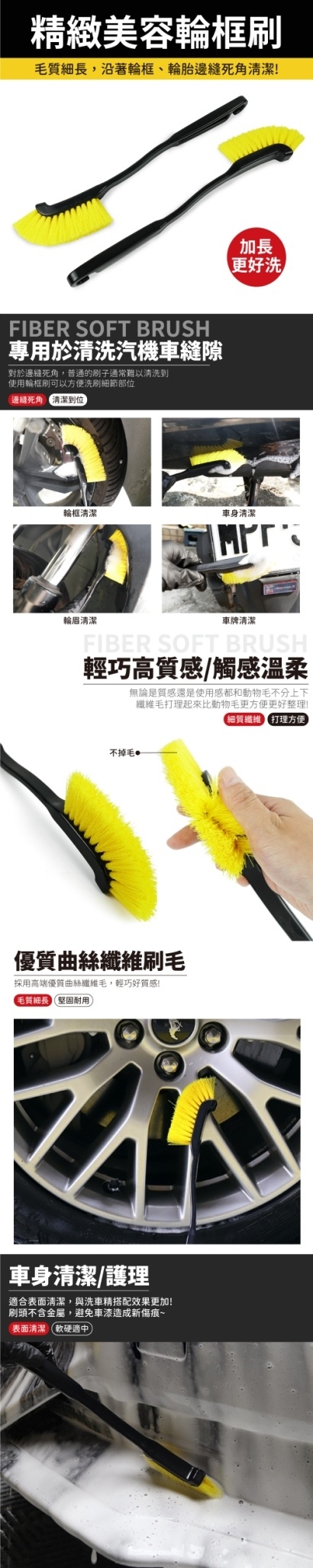 曲絲纖輪框刷是一款專為車輛輪框設計的清潔工具,采用曲線形狀的刷頭和細密的刷毛,能夠輕鬆清潔車輪、輪框及其他難以觸及的區域。這款刷子通常具有柔軟的纖維刷毛,有效去除輪框上的灰塵、油污、鐵粉及其他污垢,並且不會損傷車輪的表面或漆面。其獨特的設計能夠深入車輪的每個角落,幫助車主保持車輛輪框的光亮和整潔。