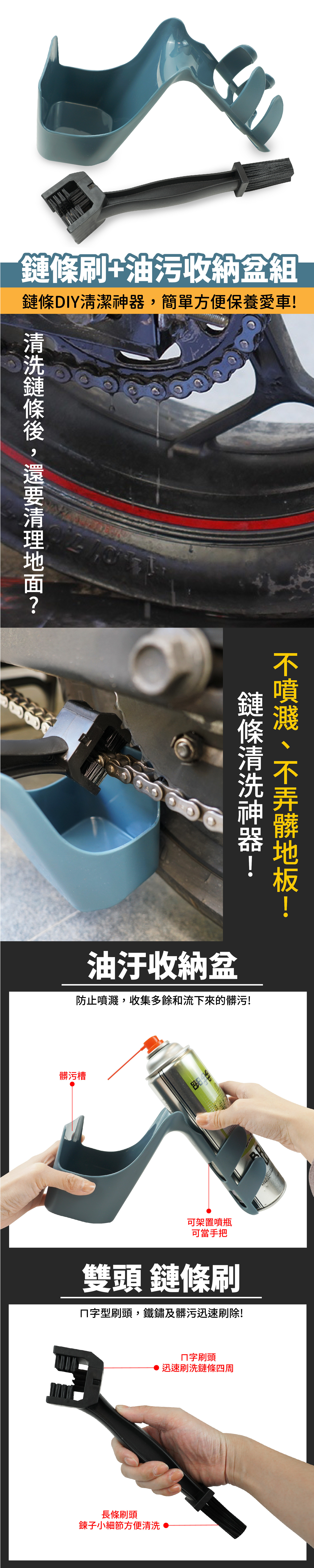 鍊條刷+油汙收納盆組,是一套專為清潔自行車或摩托車鏈條而設計的工具組。它包含一把專業的鍊條刷和一個油汙收納盆,旨在有效去除鏈條上的污垢和油脂。這套組合不僅能夠清潔鏈條,還能方便地收集和處理污油,避免油汙亂流,保持清潔和環境整潔。對於車主來說,這是一個高效且實用的維護工具組,讓日常保養更加簡便。