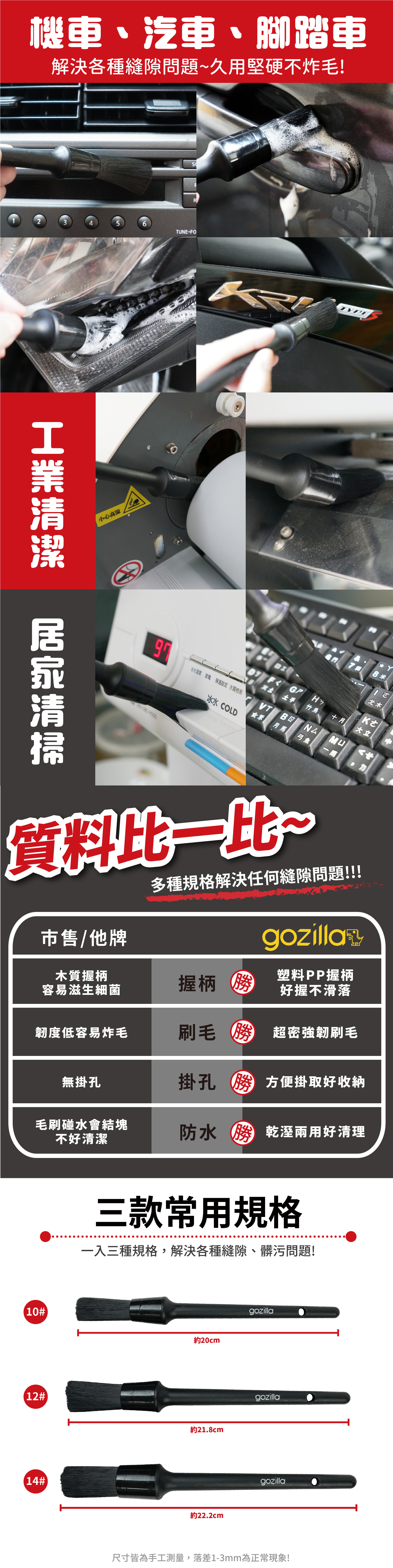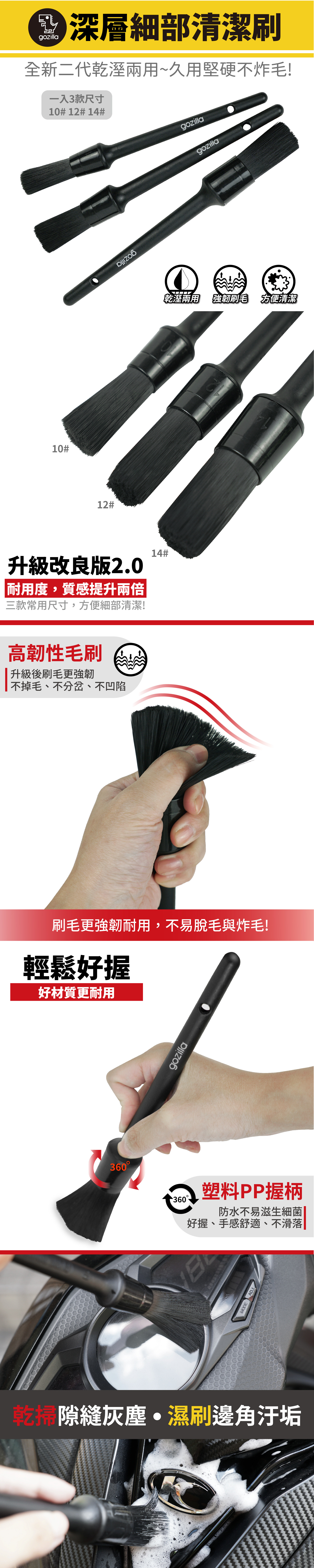 **深層細部清潔刷3件組**是一套專為精細清潔設計的工具組,包含三種不同大小和形狀的刷子,適用於清潔車輛、家居及其他細小空隙和難以觸及的區域。這些刷子能深入車輛內部、儀表板縫隙、座椅縫線等狹小部位,徹底清除灰塵、污垢及油漬。無論是日常保養還是專業清潔,這款刷子組合都能提供高效且細緻的清潔效果,讓清潔工作更加便捷。