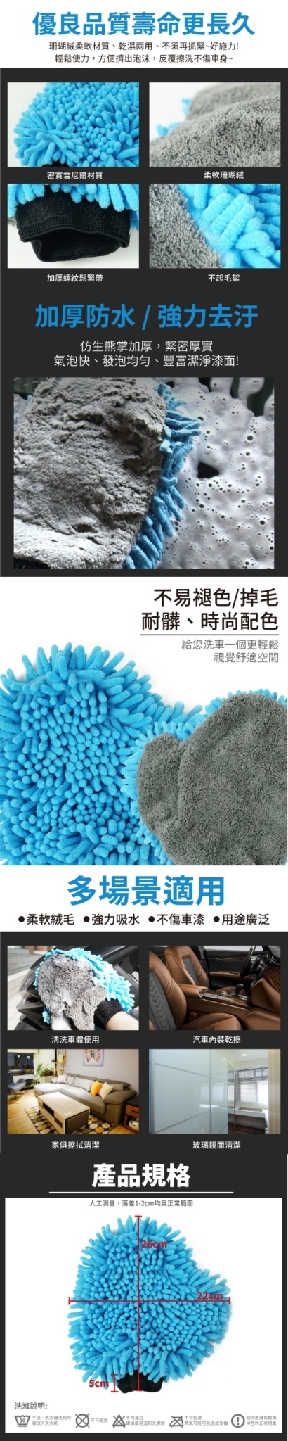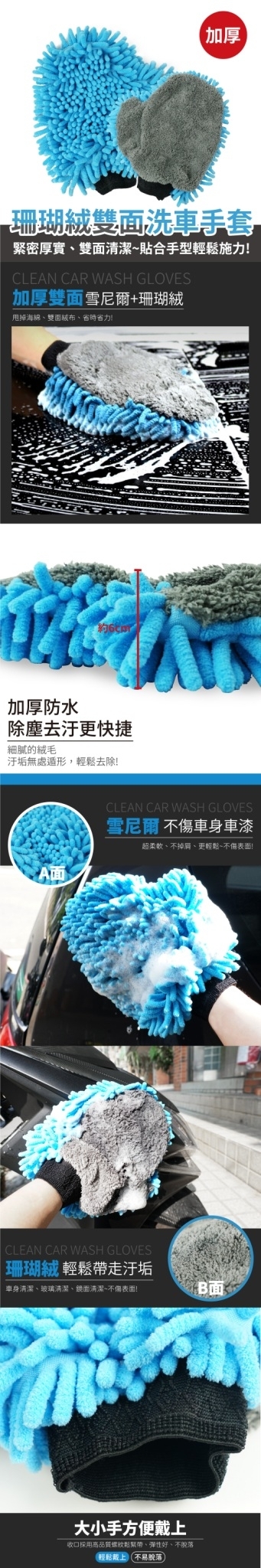 一款用於車輛清潔的高品質清潔工具。它由柔軟的珊瑚絨材料製成,具有優異的吸水性和柔順的觸感,適合用來清洗車身表面。這款手套不僅能有效去除灰塵和污垢,還能在清潔過程中避免刮傷車漆,是車主常用的清潔必備工具。適合用於各類車輛表面的清洗與保養,提供舒適且高效的清潔體驗。