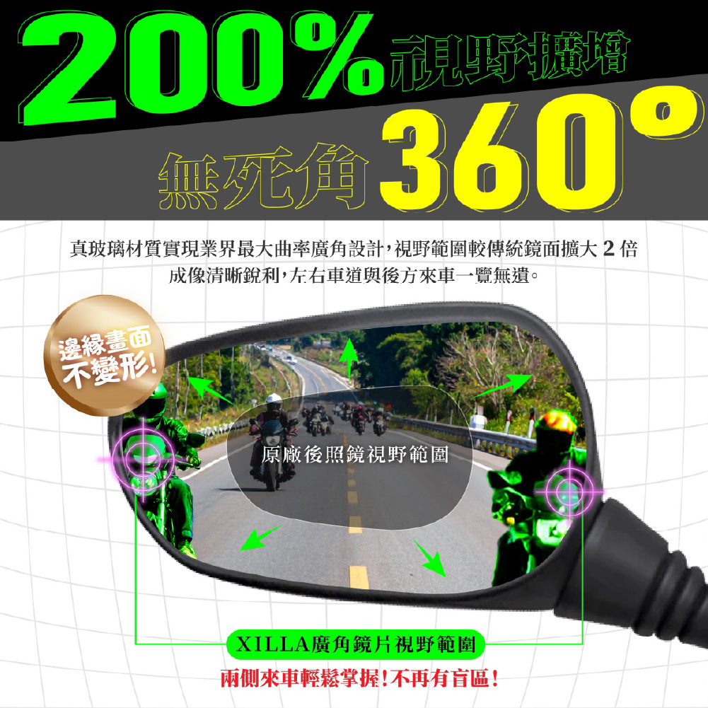 真玻璃材質實現 業界最大曲率 廣角設計,視野範圍較傳統鏡面擴大 2 倍,且邊緣無魚眼變形,左右車道與後方來車一覽無遺。