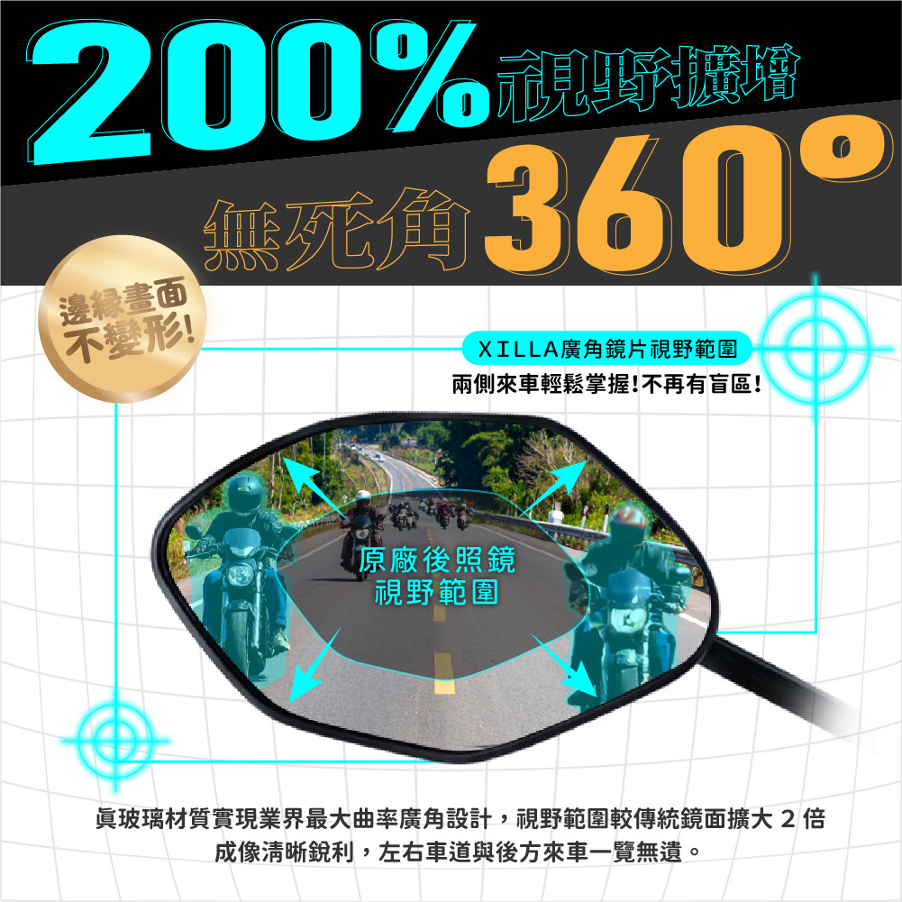 ●鏡片主要以凸面廣角來增大視野範圍,同時也會使鏡中的物體看起來比原本的更小,安裝後可能需重新適應後方來車的距離,初期請小心騎乘以避免交通事故。