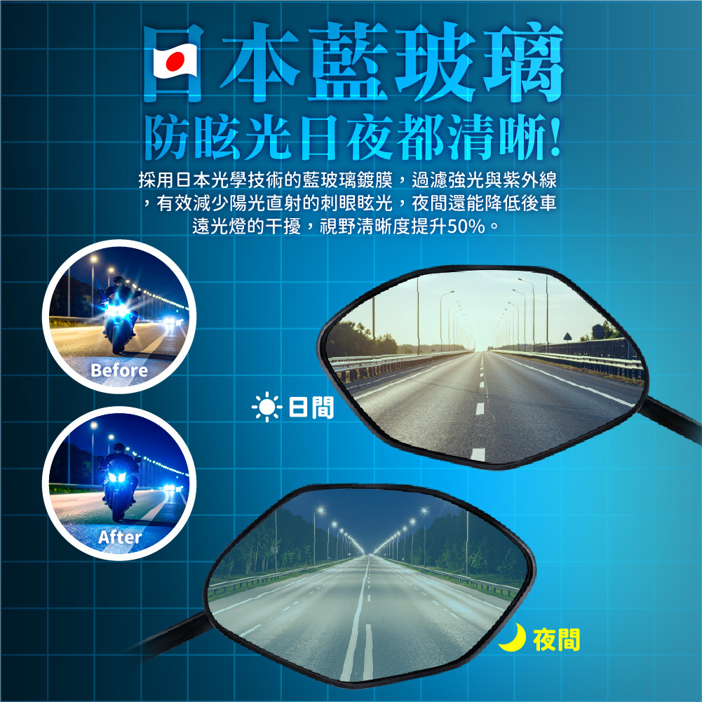 採用日本光學技術的藍玻璃鍍膜,過濾強光與紫外線,有效減少陽光直射的刺眼眩光,夜間還能降低後車遠光燈的干擾,視野清晰度提升50%。