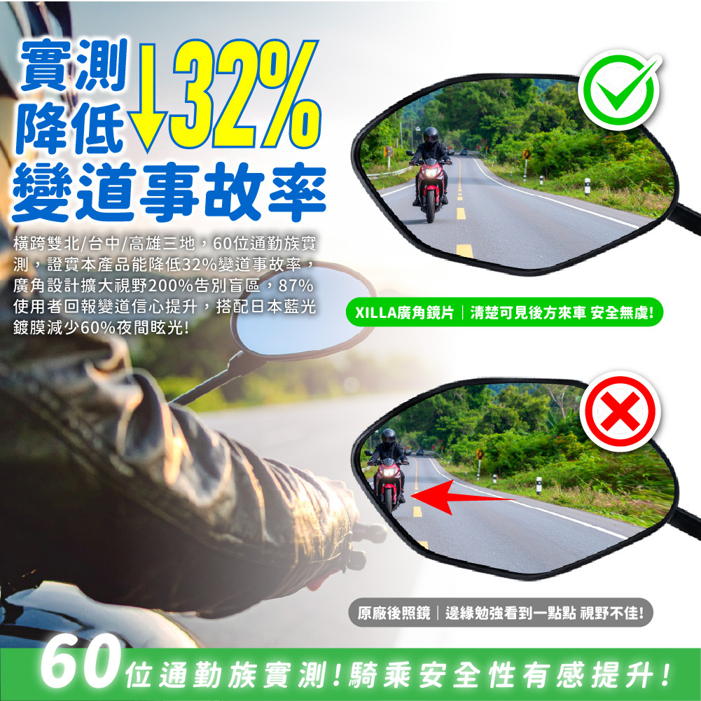 橫跨雙北/台中/高雄三地,60位通勤族實測,證實本產品能降低32%變道事故率,廣角設計擴大視野200%告別盲區,87%使用者回報變道信心提升,搭配日本藍光鍍膜減少60%夜間眩光