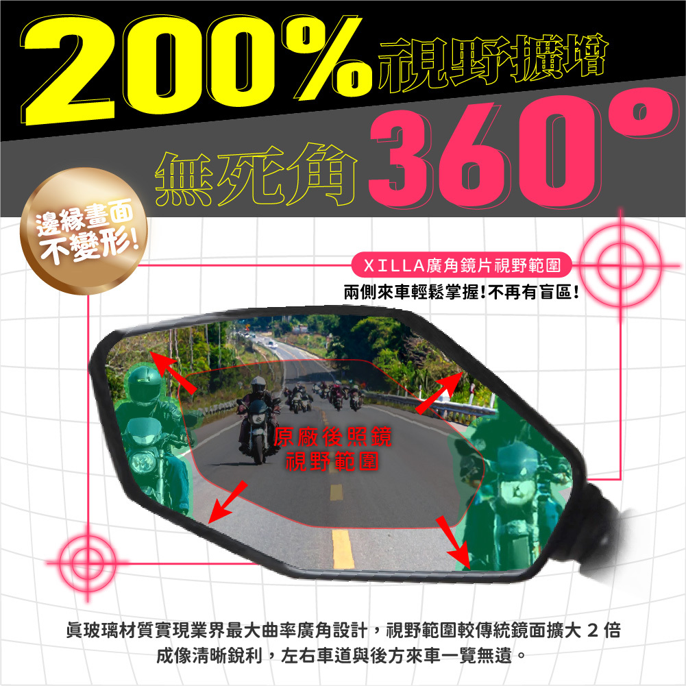 真玻璃材質實現 業界最大曲率 廣角設計,視野範圍較傳統鏡面擴大 2 倍,且邊緣無魚眼變形,左右車道與後方來車一覽無遺。