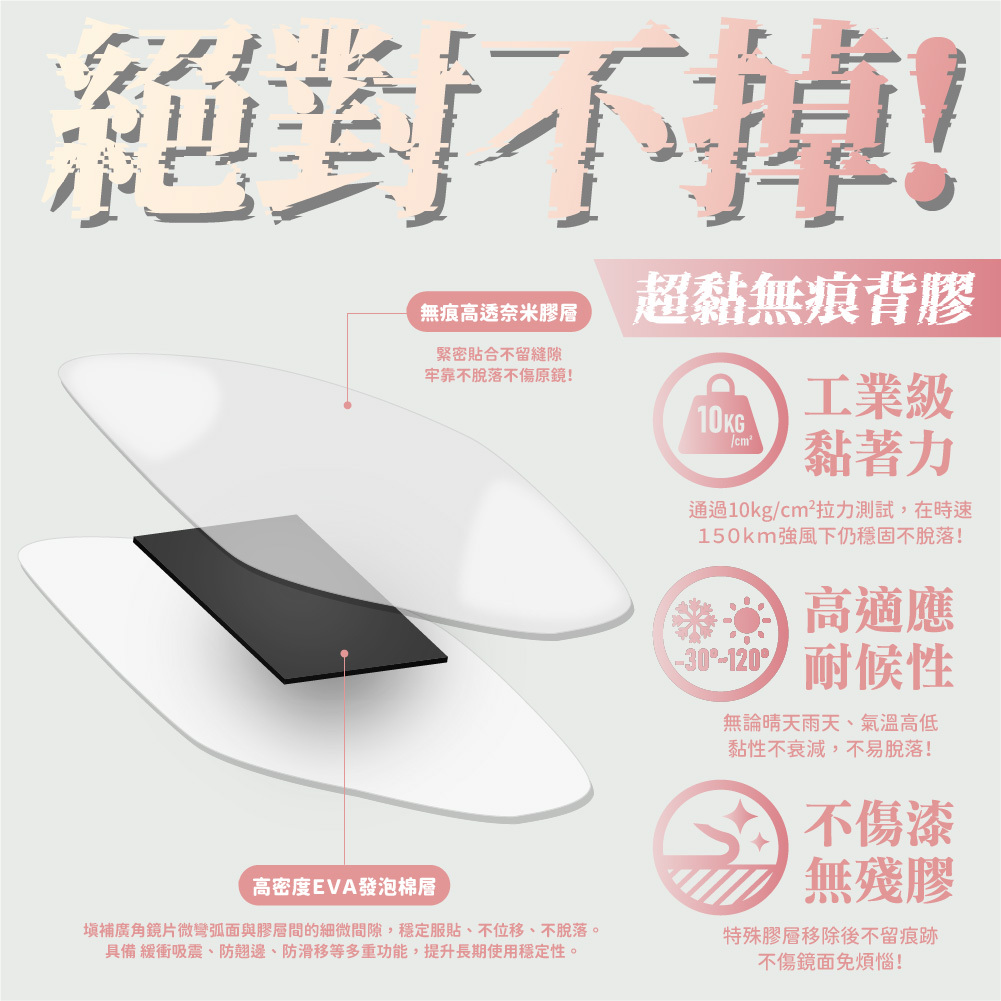 ●鏡片皆以原廠後照鏡尺寸開發,專車專用,若您有改裝後照鏡會無法安裝,購買/撕除背膠黏貼前請確認形狀是否一致。