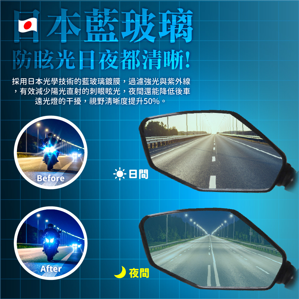 採用日本光學技術的藍玻璃鍍膜,過濾強光與紫外線,有效減少陽光直射的刺眼眩光,夜間還能降低後車遠光燈的干擾,視野清晰度提升50%。