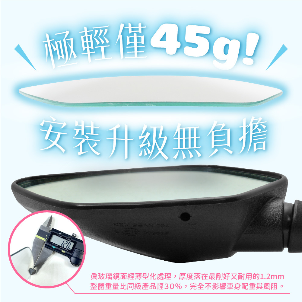 真玻璃鏡面經 薄型化處理(厚度 1.2mm),整體重量比同級產品輕 30%,完全不影響車身配重與風阻。