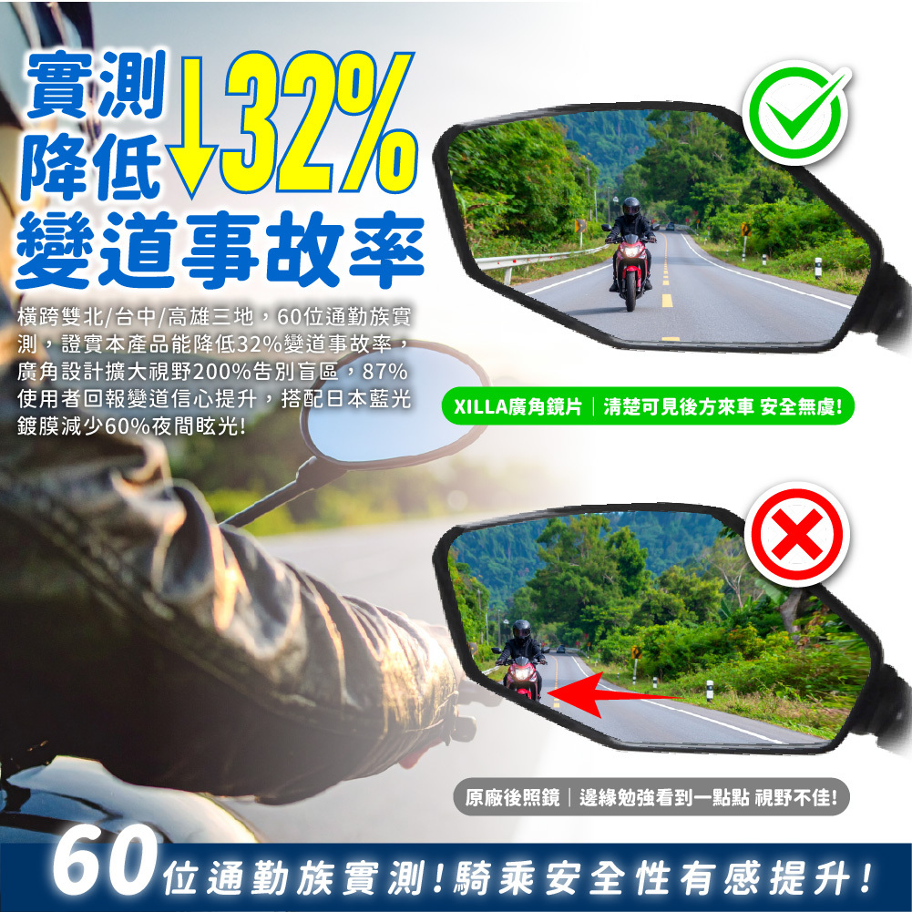 橫跨雙北/台中/高雄三地,60位通勤族實測,證實本產品能降低32%變道事故率,廣角設計擴大視野200%告別盲區,87%使用者回報變道信心提升,搭配日本藍光鍍膜減少60%夜間眩光
