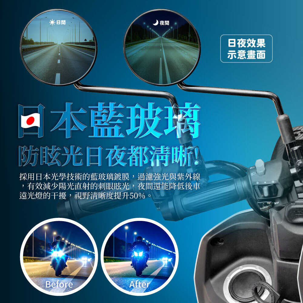 ●鏡片主要以凸面廣角來增大視野範圍,同時也會使鏡中的物體看起來比原本的更小,安裝後可能需重新適應後方來車的距離,初期請小心騎乘以避免交通事故。