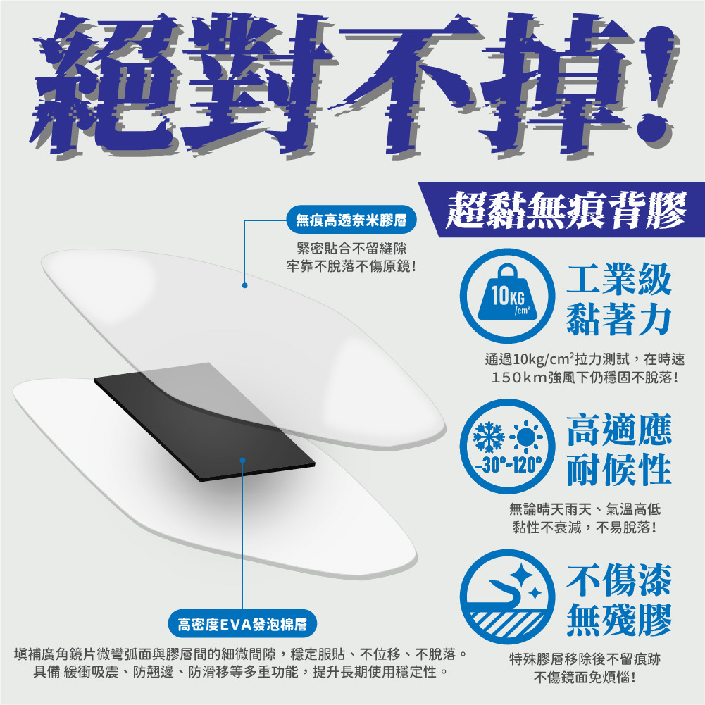 ► 耐極端環境:-30°C~120°C範圍內黏性不衰減,雨天、高溫皆可靠。