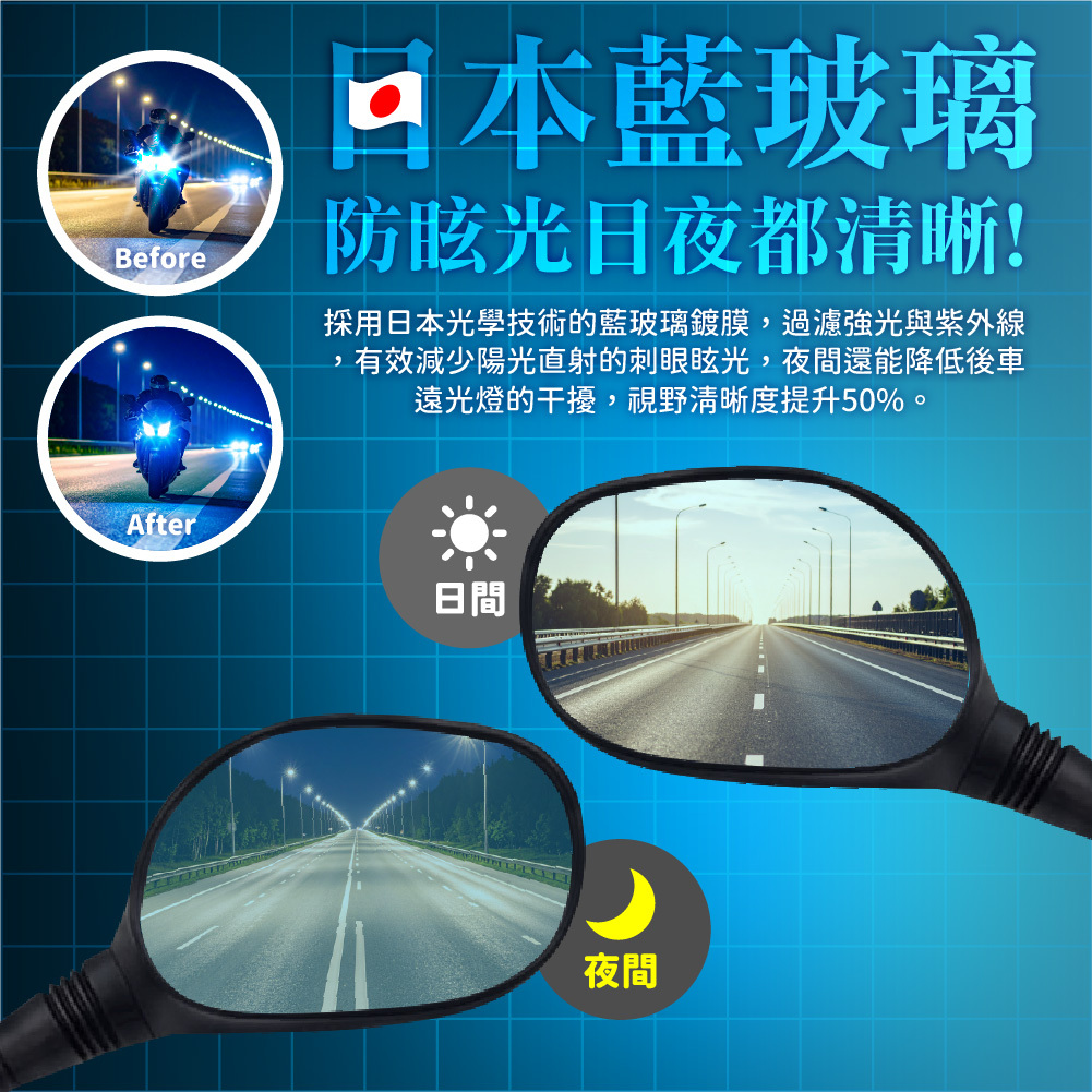 採用日本光學技術的藍玻璃鍍膜,過濾強光與紫外線,有效減少陽光直射的刺眼眩光,夜間還能降低後車遠光燈的干擾,視野清晰度提升50%。