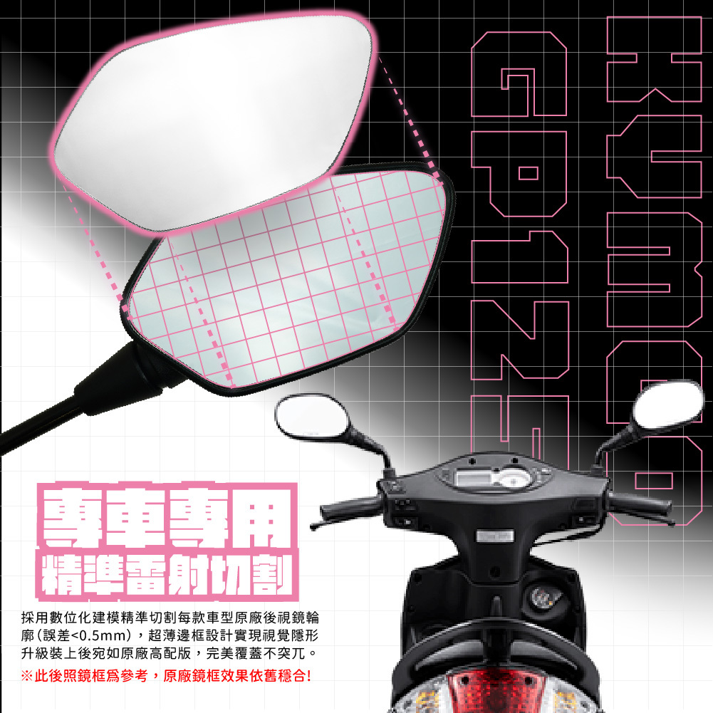 專為 KYMCO GP 125 設計的超視野廣角後照鏡,採用高解析鏡面與防眩光處理,有效擴大後方視野,減少盲區,提高行車安全。鏡面清晰耐用,即使夜間或強光照射下也能保持穩定視線。安裝方便,完美替換原廠鏡片,與車身線條貼合,外型簡潔時尚。兼具實用性與美觀,是日常通勤、城市穿梭或長途騎乘的理想升級配件。