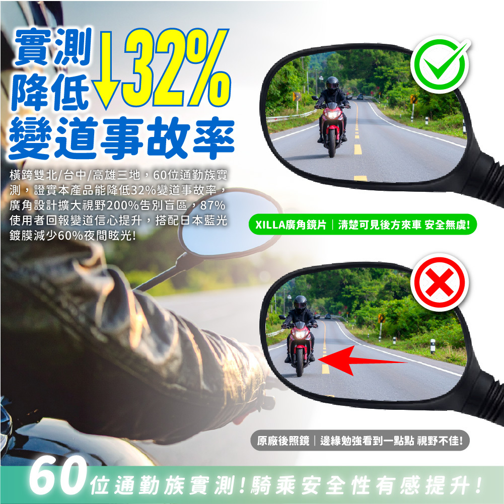 橫跨雙北/台中/高雄三地,60位通勤族實測,證實本產品能降低32%變道事故率,廣角設計擴大視野200%告別盲區,87%使用者回報變道信心提升,搭配日本藍光鍍膜減少60%夜間眩光