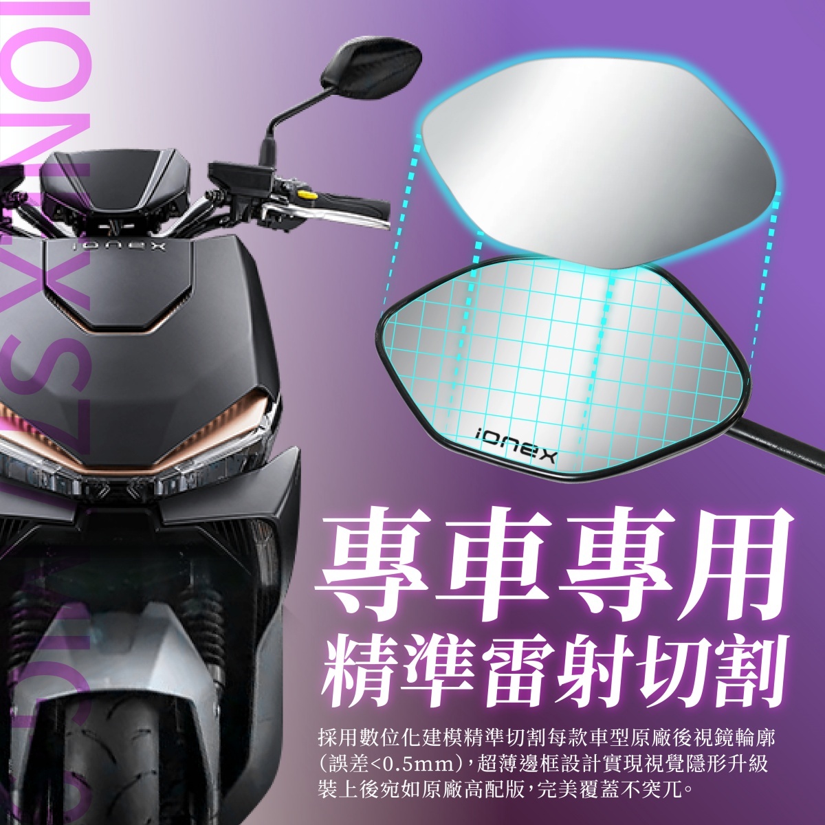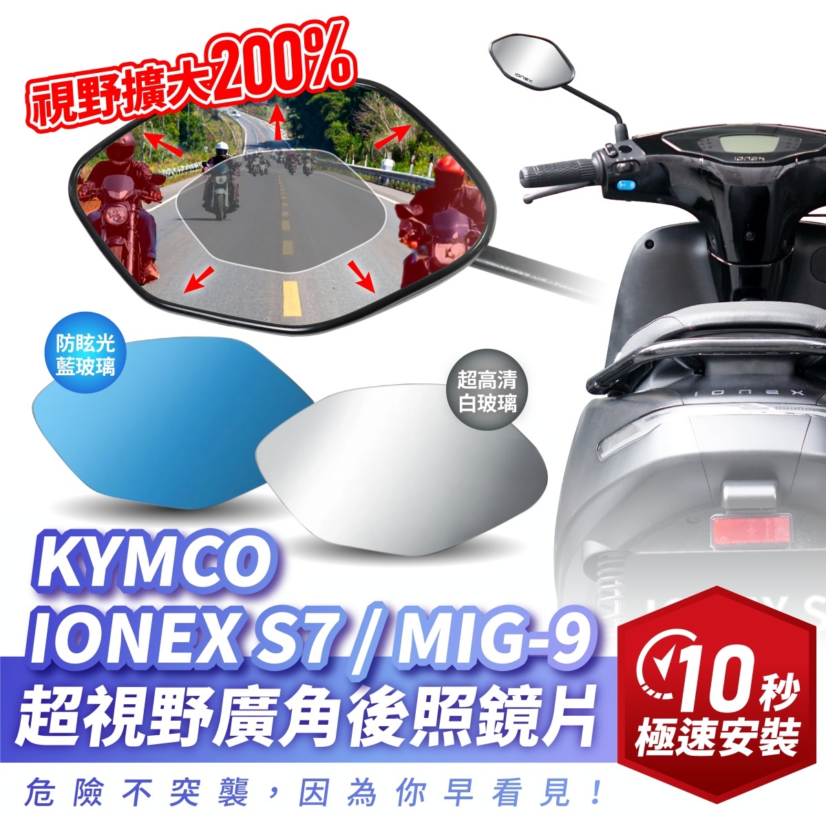 專為 KYMCO IONEX S7 / MIG 9 設計!本廣角後照鏡貼片採用真玻璃製成,畫面清晰不變形,視野擴大 200% 有效減少盲區,搭配防眩光鍍膜,白天不刺眼、夜間不怕遠光燈干擾。奈米膠強力貼合、無痕不傷鏡面,耐熱耐冷不脫落,安裝快速免工具,是 KYMCO IONEX S7 / MIG 9 車主必備的行車安全升級配件!