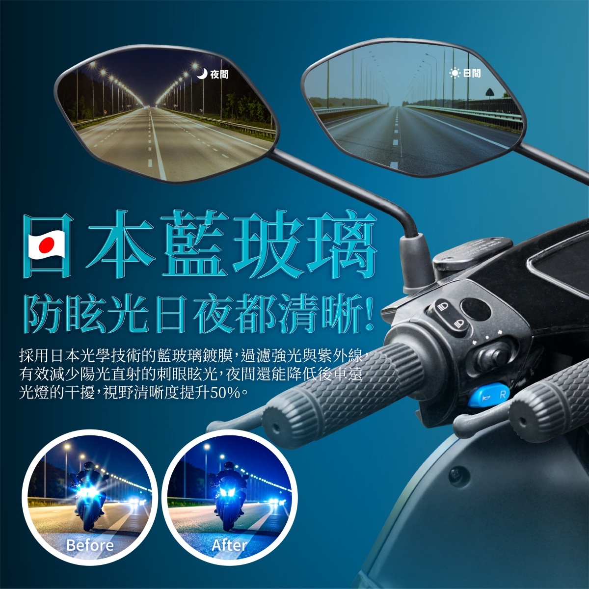 採用日本光學技術的藍玻璃鍍膜,過濾強光與紫外線,有效減少陽光直射的刺眼眩光,夜間還能降低後車遠光燈的干擾,視野清晰度提升50%。