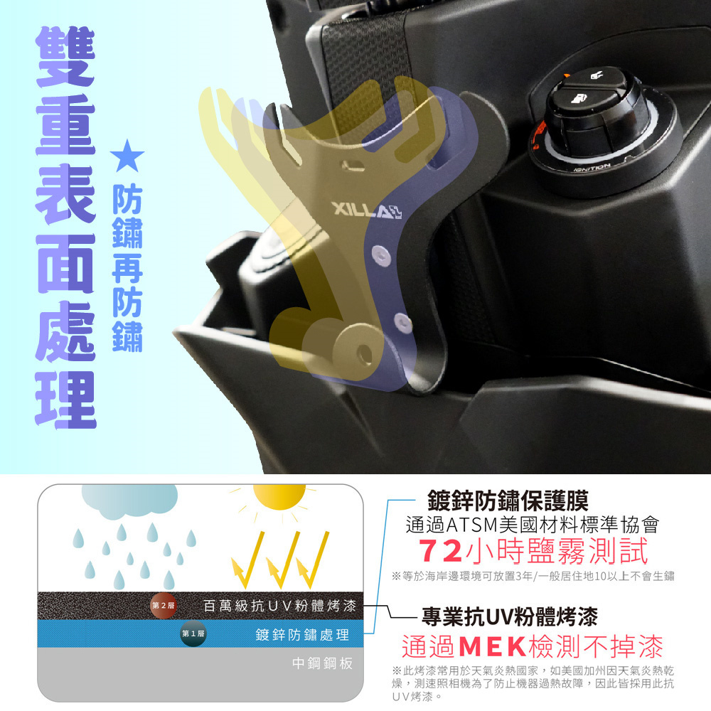 👍通過72小時美國材料標準協會制定鹽霧測試,(等同於機車停放在海岸邊3年不動也不會生鏽,一般居住地方10年以上)